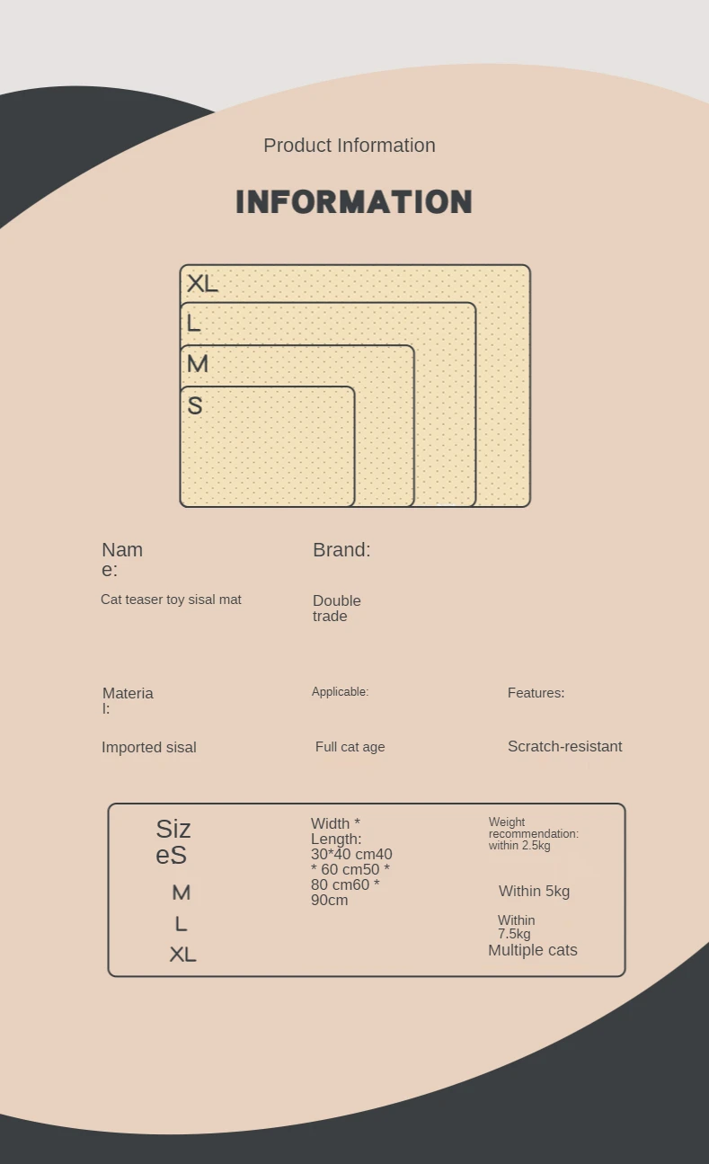 Характеристика:1. Этот продукт использует три стиля коврик из сизаля/соломенный коврик/ковер для защиты кошачьих когтей от вреда.2. Его можно свернуть вертикально или горизонтально, подходит для различных ножек стола.3. Он может быть закреплен на ногах стула, Ножках Стола и других местах для защиты мебели от царапин.Примечание: цвета отправляются случайным образомПараметр:Материал: сизальРазмер:S: 30*40 см/11,8 * 15.74inМ: 40*60 см/15,74*23,62 дюймаL: 50*80 см/19,6*31,49 дюймаXL: 60*90 см/23,62*35,43 дюймаПреимущества: коврик из сизаля более прочный и удобный для хранения! Используется в нескольких местахУпаковочный лист:1 * кошечка для царапин