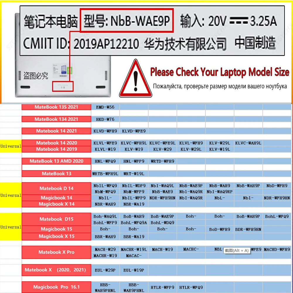 Уважаемый клиент, пожалуйста, дважды проверьте номера своей модели в приведенном ниже списке перед заказом любых чехлов для ноутбуков. Эти жесткие чехлы предназначены только для ноутбука Huawei / Honor; Пожалуйста, не используйте для других ноутбуков. Если вы не уверены в номере вашей модели, вы всегда можете связаться с нами. Мы будем рады помочь Вам найти подходящий чехол.