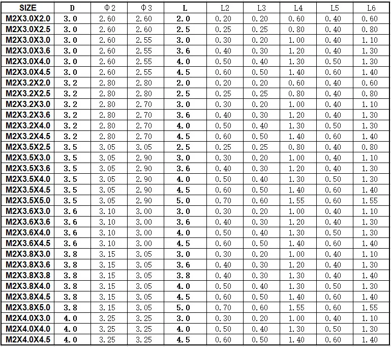 Пример: M2 X D4.0 X L3.0 ( Диаметр резьбы 2 мм X наружный диаметр 4,0 мм X общая длина 3,0 мм )