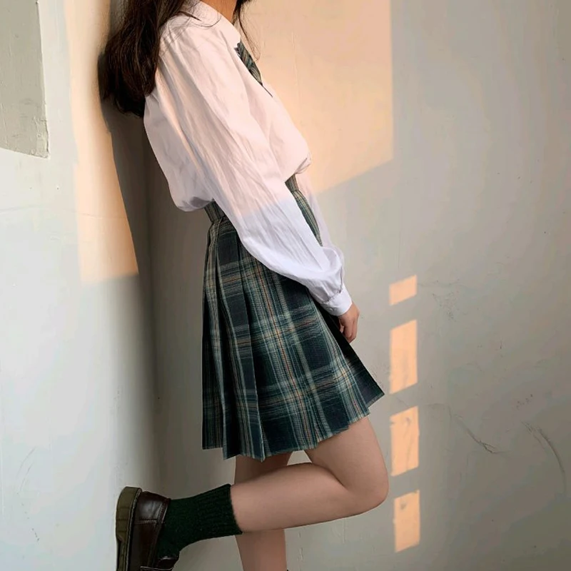 Школьная униформа для девочек, плиссированные юбки, японская школьная форма, с высокой талией, трапециевидная клетчатая юбка, сексуальная униформа JK для женщин, полный комплект