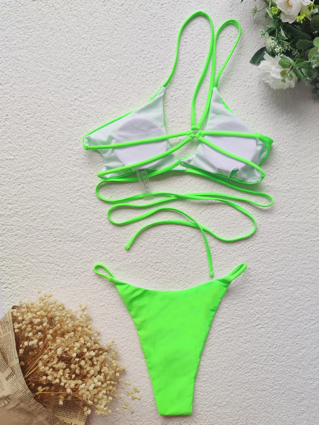 Сексуальный неоновый зеленый бикини 2022 Mujer женский Одноцветный пуш-ап бандажный купальник с одним плечом пляжный купальный костюм с вырезами купальник-стринги