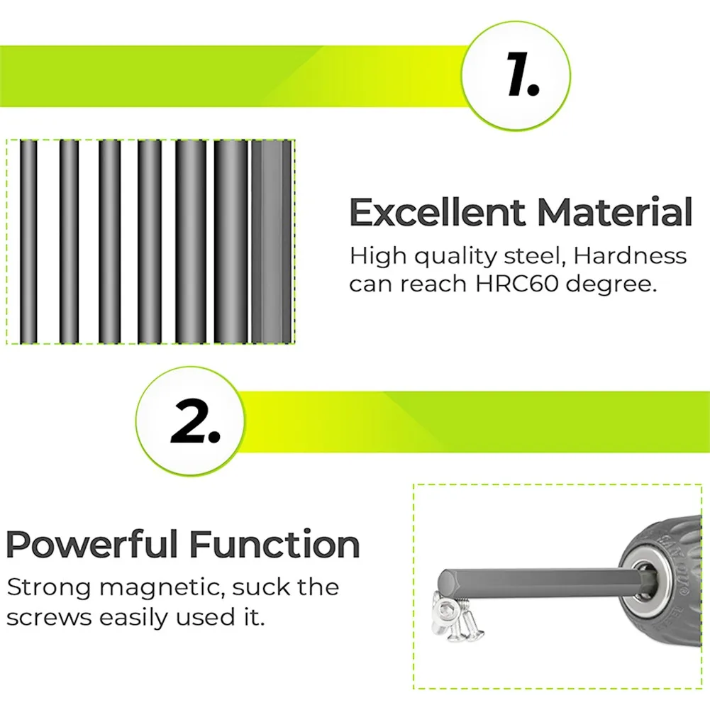 3. 【Профессиональный Набор шестигранных бит изготовлен из легированной стали S2, очень хорошо сделан и прочен, так как твердость может достигать HRC60 градусов. Набор шестигранных ключей подходит для электрических сверл с устройством регулирования скорости, электрических отверток, ручных отверток.
