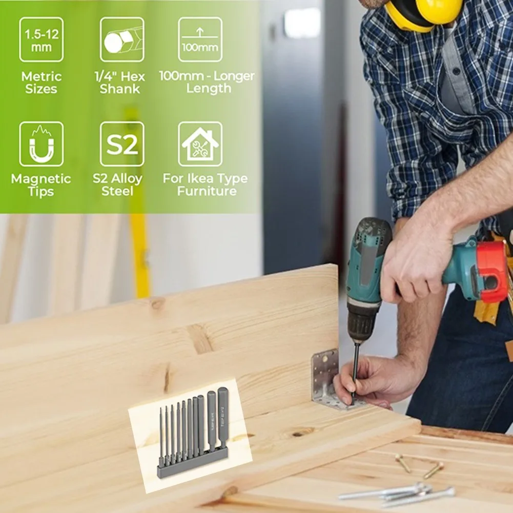 1.【Allen ключ, дюймовый стандарт набор сверл включает 10 самых популярных метрических Sizes】 1,5 мм, 2 мм, 2,5 мм, 3 мм, 4 мм, 5 мм, 6 мм, 8 мм, 10 мм, 12 мм. Набор бит хвостовик: 6,35 мм/1/4 ", Длина: 100 мм (3,94").