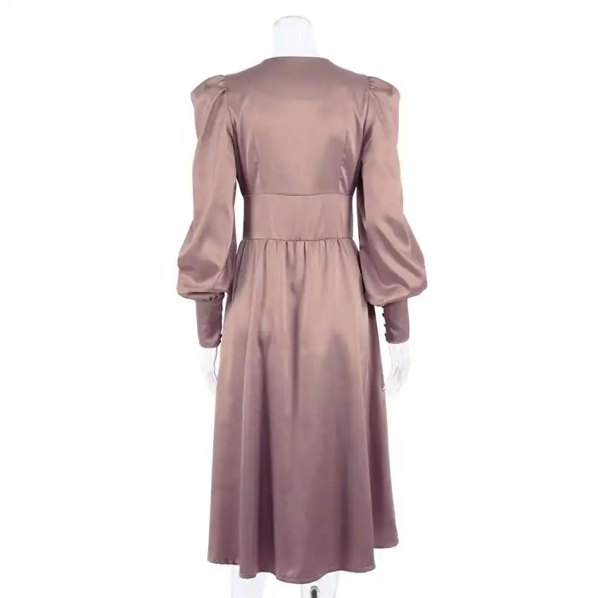 Женское атласное платье-рубашка с длинным рукавом и V-образным вырезом