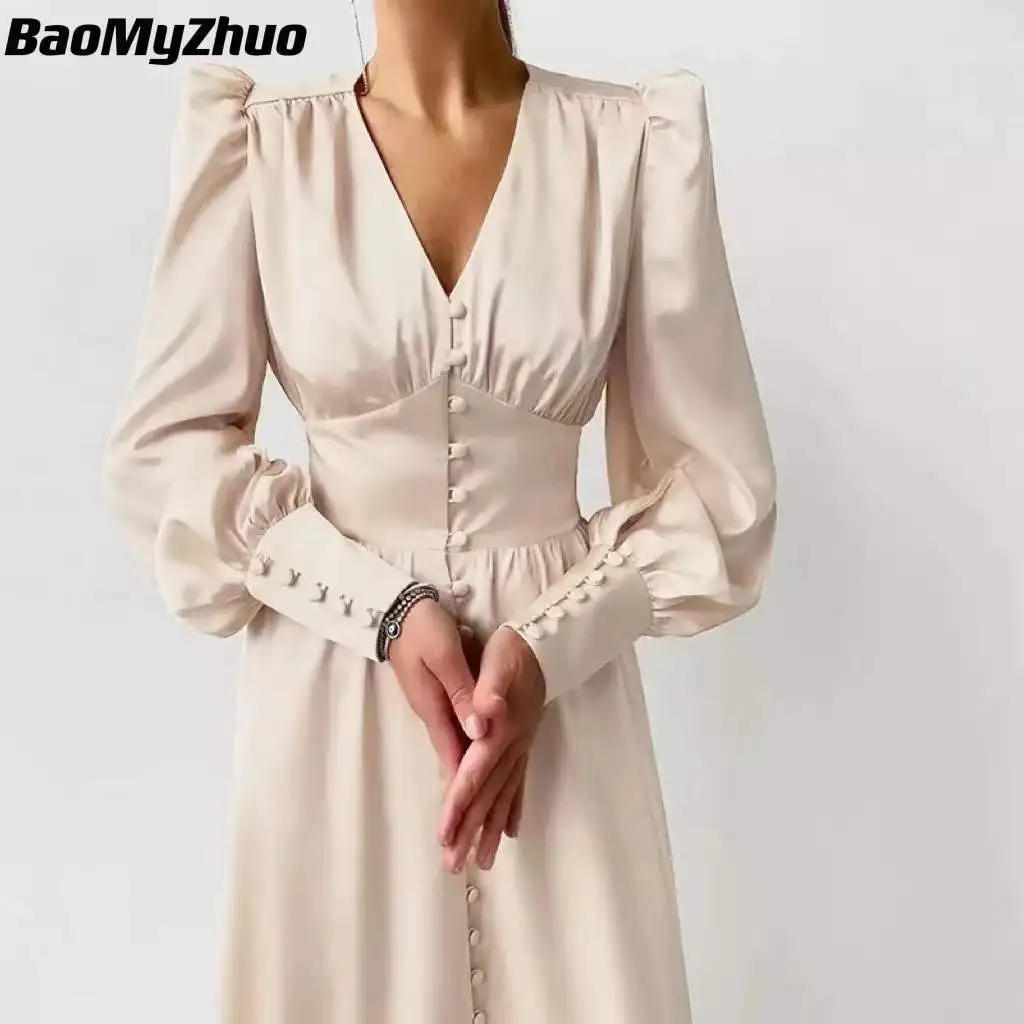 Женское однобортное атласное платье миди VestidosMujer, бежевое эле...
