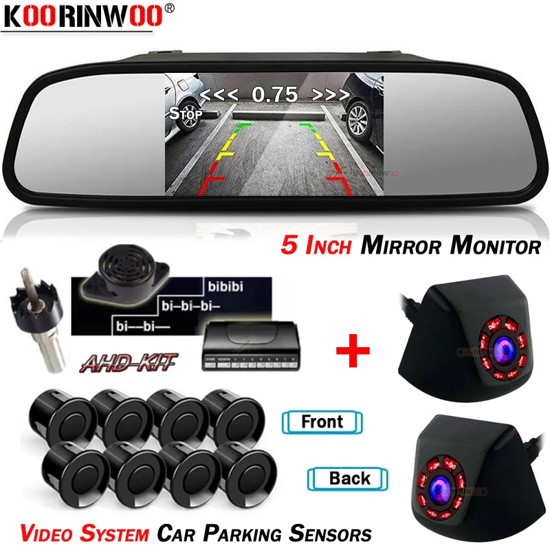 Koorinwoo парктроник AHD 170 широкая HD камера задняя + Передняя 8 парковочных датчиков 5-дюймовый монитор зеркало изображение радар-детектор помощь
