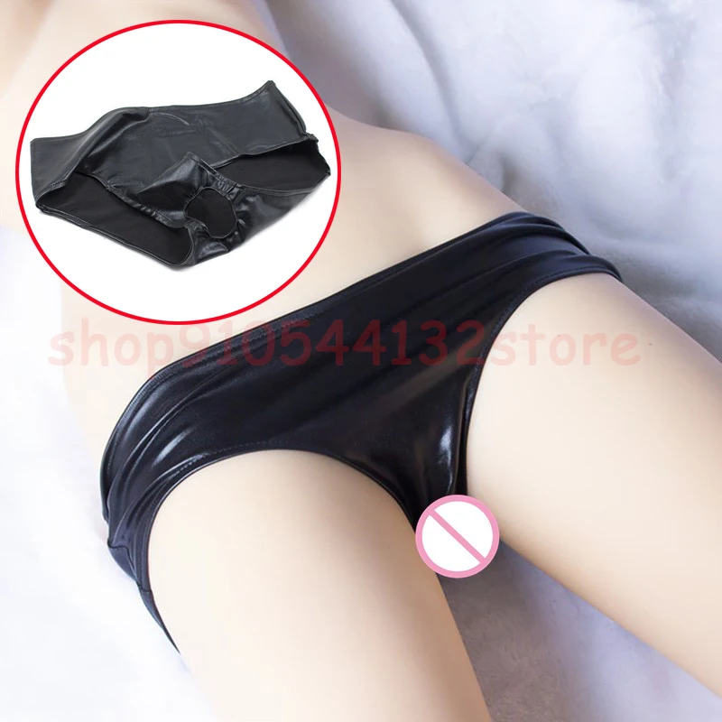 БДСМ Эротические трусики с отверстием Wetlook из искусственной кожи страпон открытый промежность трусы женские сексуальные трусики сексуальное Целомудрие продукты