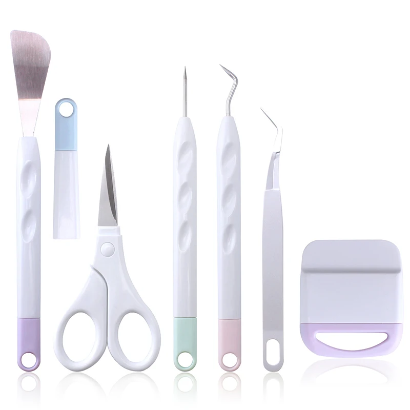 Набор инструментов с шестью инструментами. Включает в себя: ножницы, пинцет, крючок, скребок и шпатель для использования с Cricut Explore ore и Maker Machines.