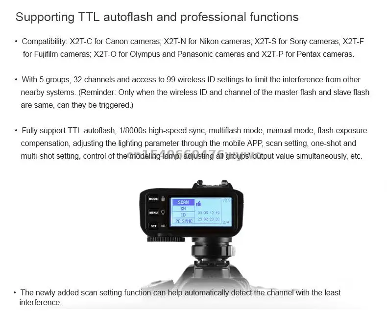 -5 групп, 32 канала и доступ к 99 настройкам беспроводного ID для ограничения помех от других расположенных рядом систем. (Напоминание: только когда беспроводной идентификатор и канал master flash slave flash одинаковы, они могут быть отключены.)