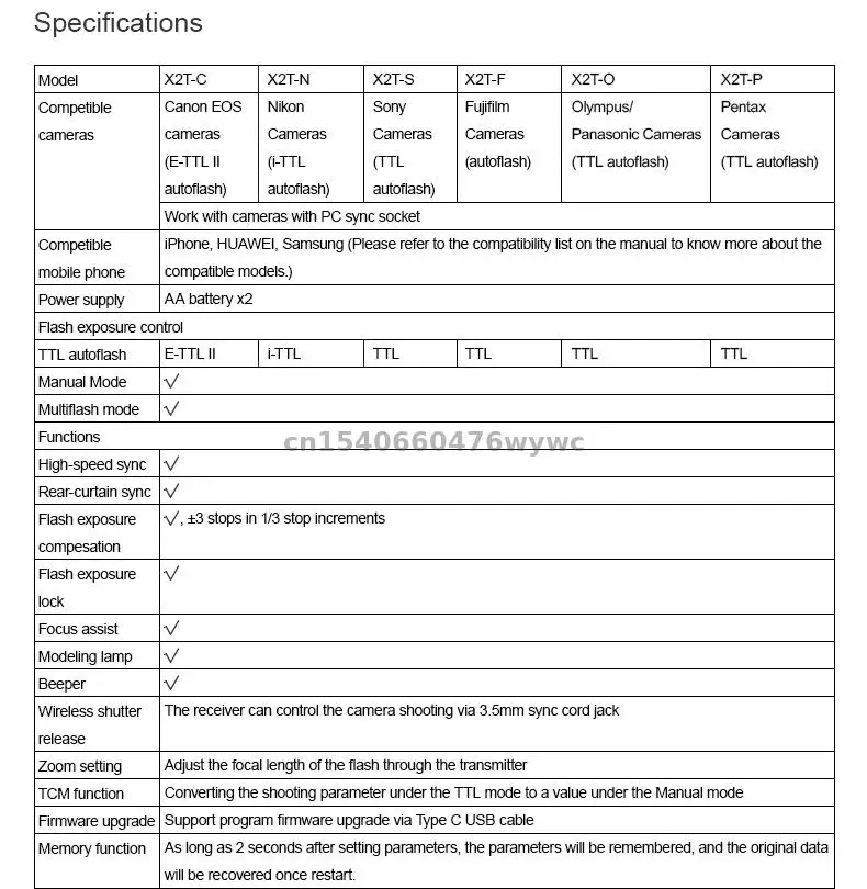 -Совместимость: X2T-C для камер Canon; X2T-N для камер Nikon; X2T-S для камер Sony; X2T-F для камер Fujifilm; X2T-O для Olympus и для камер Panasonic и X2T-P для камер Pentax.
