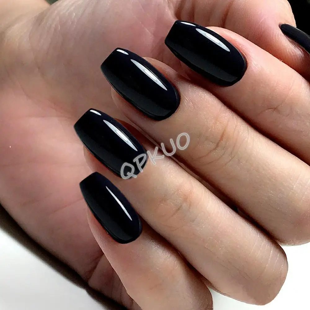 24 шт. блестящие черные накладные ногти с желеобразным клеем, искус...