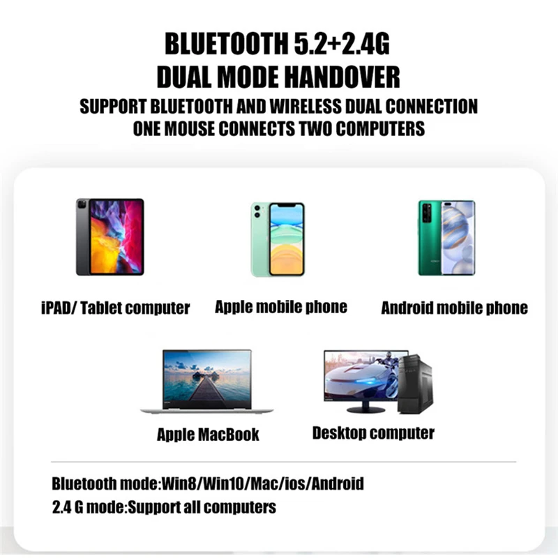 ✔Название товара: беспроводная мышь 2,4G и Bluetooth 5.2 мыши✔Кнопки: 4 кнопки✔Макс. DPI: 1600 DPI✔️ Регулируемые Точек на дюйм переключатель: 800 /1200 / 1600 Точек на дюйм✔Диапазон WiFi: 10 м✔Аккумулятор: перезаряжаемый✔• Длина кабеля для зарядки: около 35-45 см✔Время переключения: 10 м время работы✔• Размер: 112*58*25 мм✔Система поддержки: Windows / Mac / Android / iPadOS