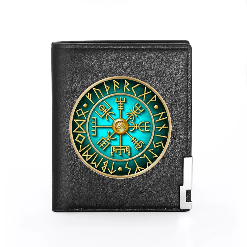 Высококачественный кожаный бумажник с рисунком символ викингов для мужчин и женщин, тонкий бумажник двойного сложения для кредитных картудостоверений личности с вставками, Короткие Кошельки