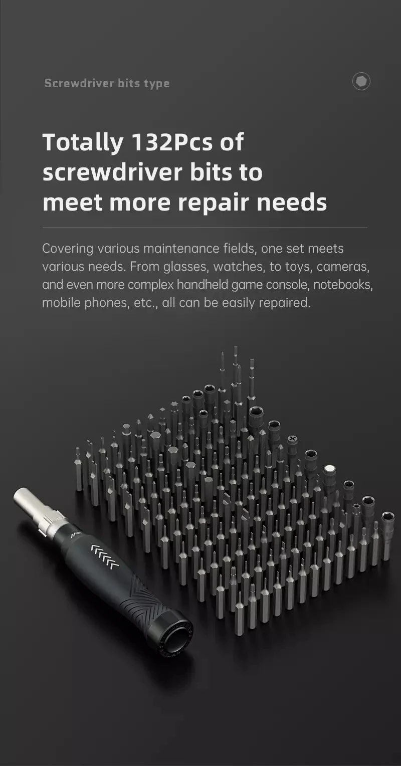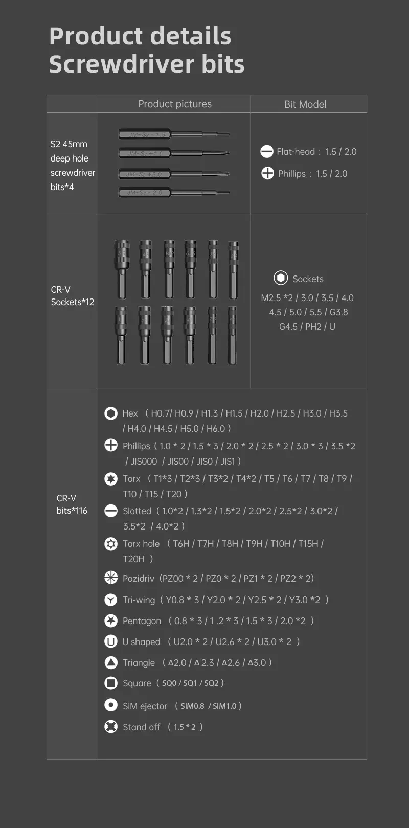 S-2 45 мм отвертка с глубоким отверстием:Плоская головка (шлицевая): 1,5 2,0Phillips: 1,5 2,0CR-V розетки:Шестигранная розетка: M2.5 * 2 M3.0 M3.5 M4.0 M4.5 M5.0 M5.5 G3.8 G4.5 PH2 UCR-V биты:Шестигранная: H0.7 H0.9 H1.3 H1.5 H2.0 H2.5 H3.0 H3.5 H4.0 H4.5 H5.0 H6.0Phillips: 1,0*2 1,5*3 2,0*2 2,5*2 3,0*3 3,5*2 JIS000 JIS00 JIS0 JIS1Торкс: T1 * 3 T2 * 3 T3 * 2 T4 * 2 T5 T6 T7 T8 T9 T10 T15 T20Плоская головка (шлицевая): 1,0*2 1,3*2 1,5*2 2,0*2 2,5*2 3,0*2 3,5*2 4,0*2Безопасность Torx: T6H T7H T8H T9H T10H T15H T20HPozidriv: PZ00 * 2 PZ0 * 2 PZ1 * 2 PZ2 * 2Три крыла: Y0.8 * 3 Y2.0 * 2 Y2.5 * 2 Y3.0 * 2Пентагон: 0,8*3 1,2*3 1,5*3 2,0*2U-образный: U2.0 * 2 U2.6 * 2 U3.0 * 2Треугольник: 2,0 2,3 2,6 3,0Площадь: SQ0 SQ1 SQ2Эжектор SIM: SIM0.8 SIM1.0Подставка для выключения: 1,5*2Spudger * 2Присоска * 1Ультратонкие инструменты для открытия * 5Пинцет * 1Удлинитель * 1Ручка * 1