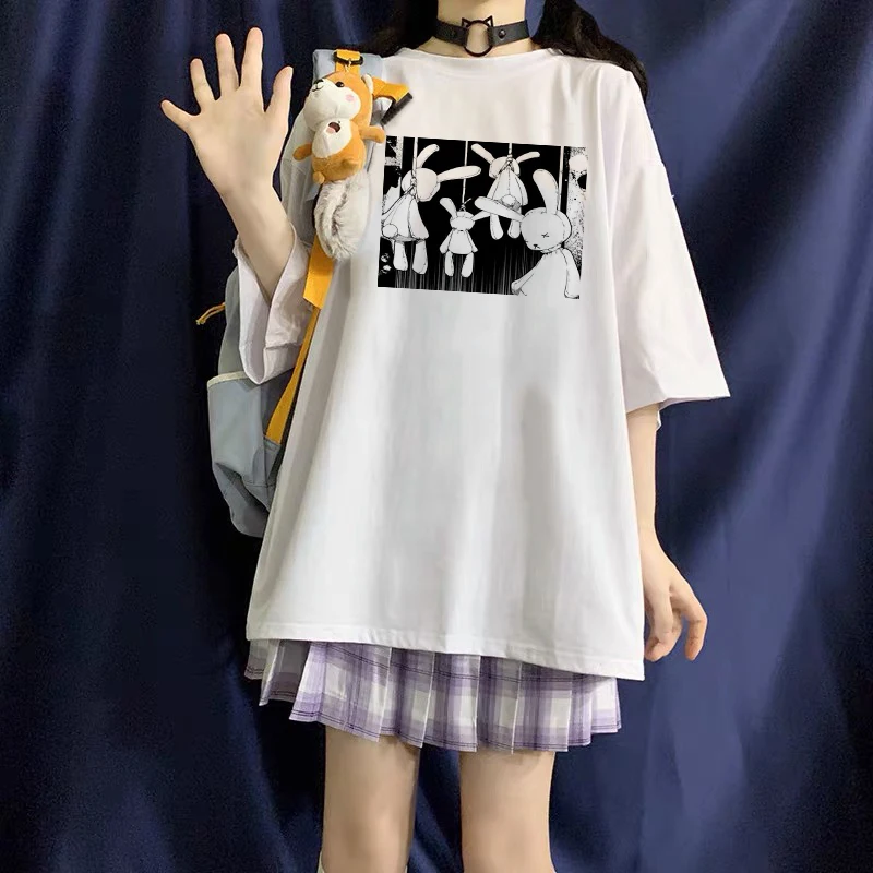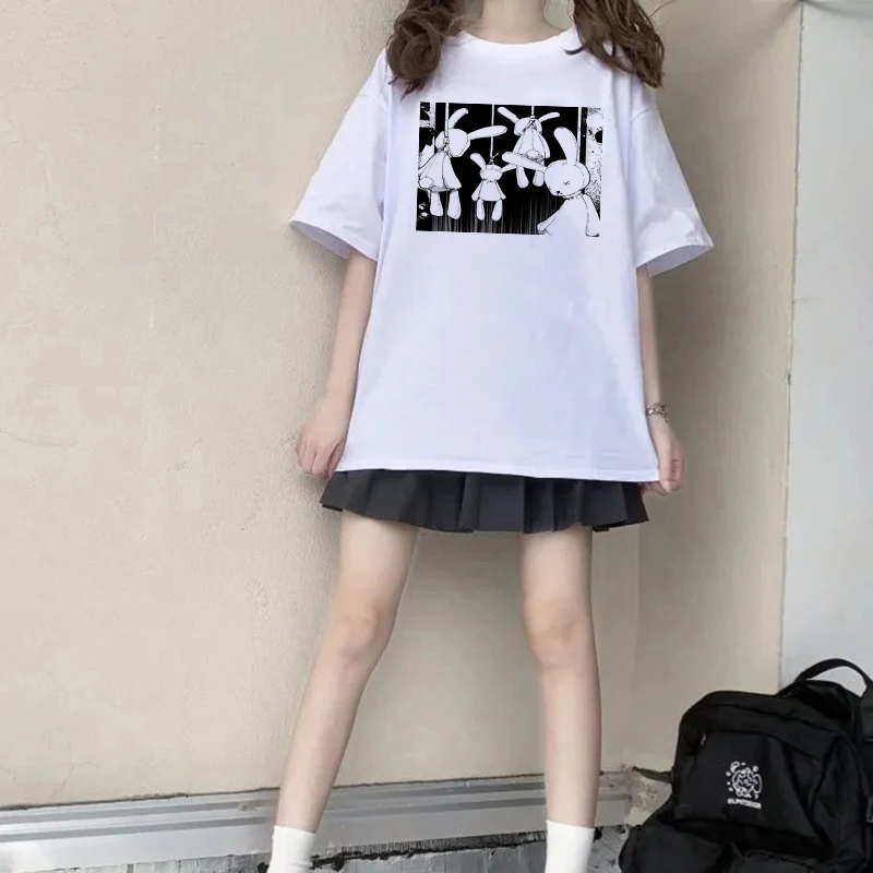 Женская футболка с принтом кролика и круглым вырезом, свободного покроя