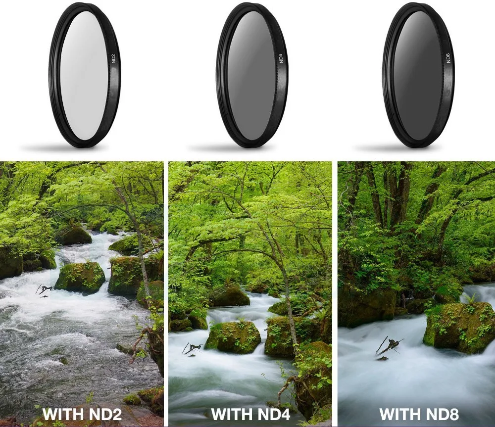 Этот набор фильтров ND поставляется в различных уровнях ND2, ND4, ND8.