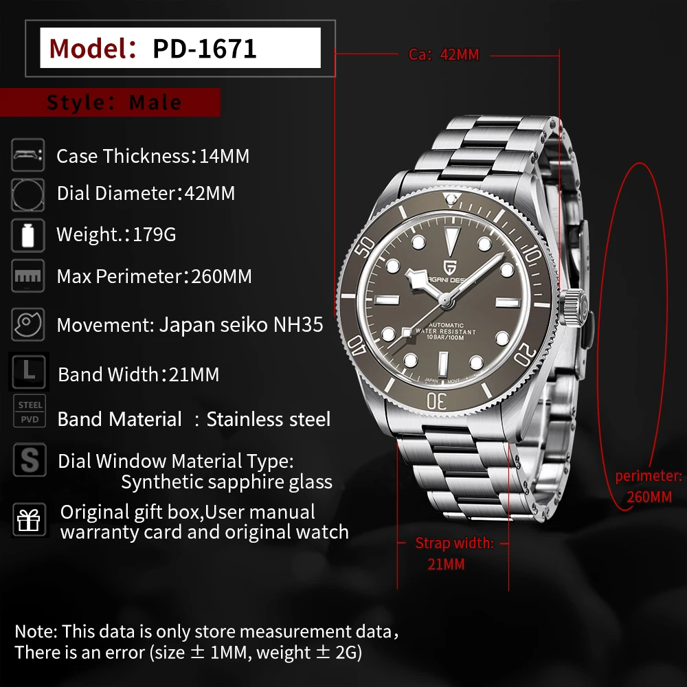 ● Водонепроницаемость 100 М: чехлы для часов идеально герметичны, наши часы Pagani водонепроницаемы до 100 м (10 бар). Чехол из нержавеющей стали оснащен винтовой головкой, что улучшает водонепроницаемость. Подходит для плавания и дайвинга, но не в горячей весенней воде