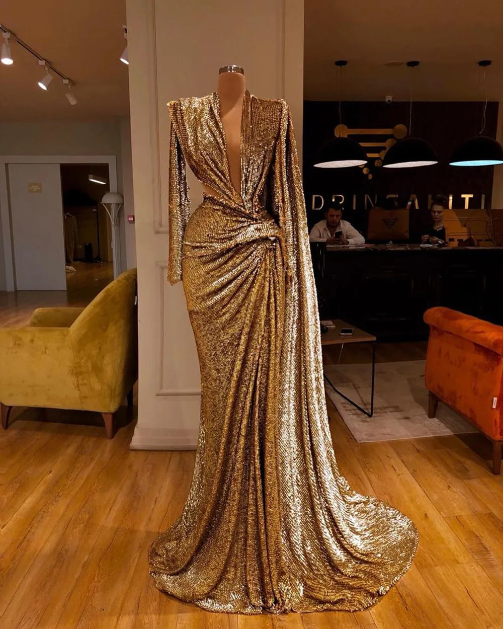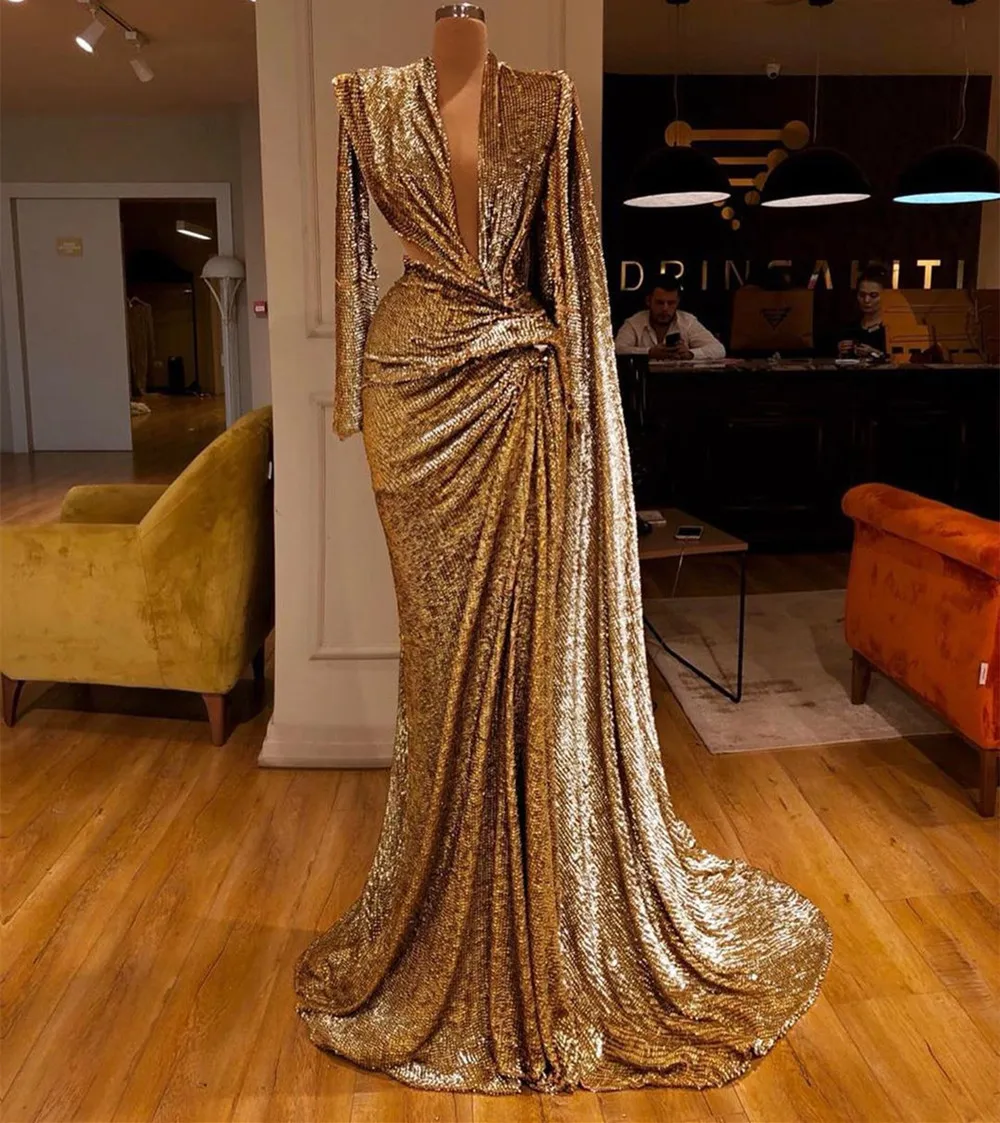 2022 блестящие пайетки золотые вечерние платья с глубоким V-образным вырезом, складками и длинными рукавами, платье русалки для выпускного вечера в африканском стиле Дубая 213