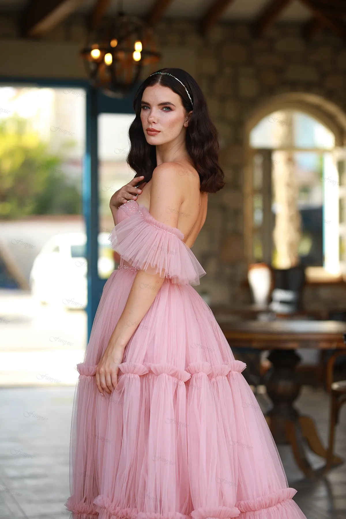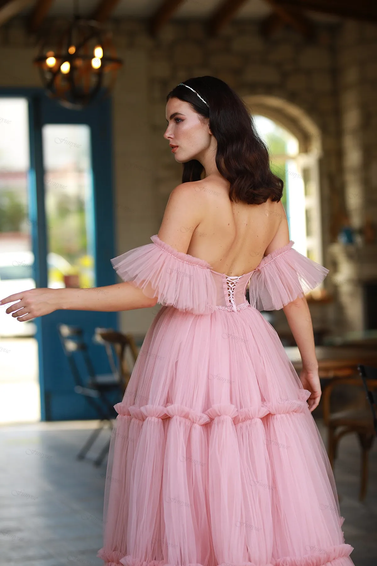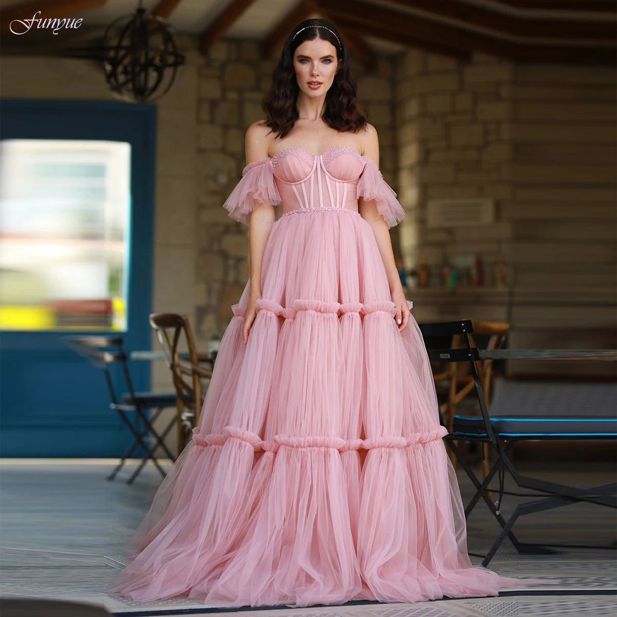Funyue розовые платья для выпускного вечера 2022 сексуальные с открытыми плечами Вечерние платья Длинные трапециевидные тюлевые вышитые бисером платья для торжества