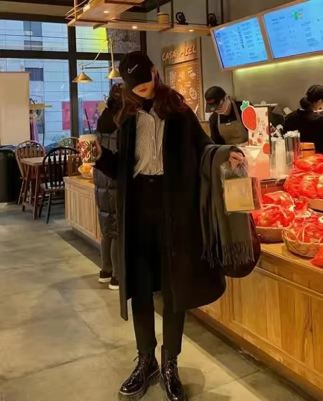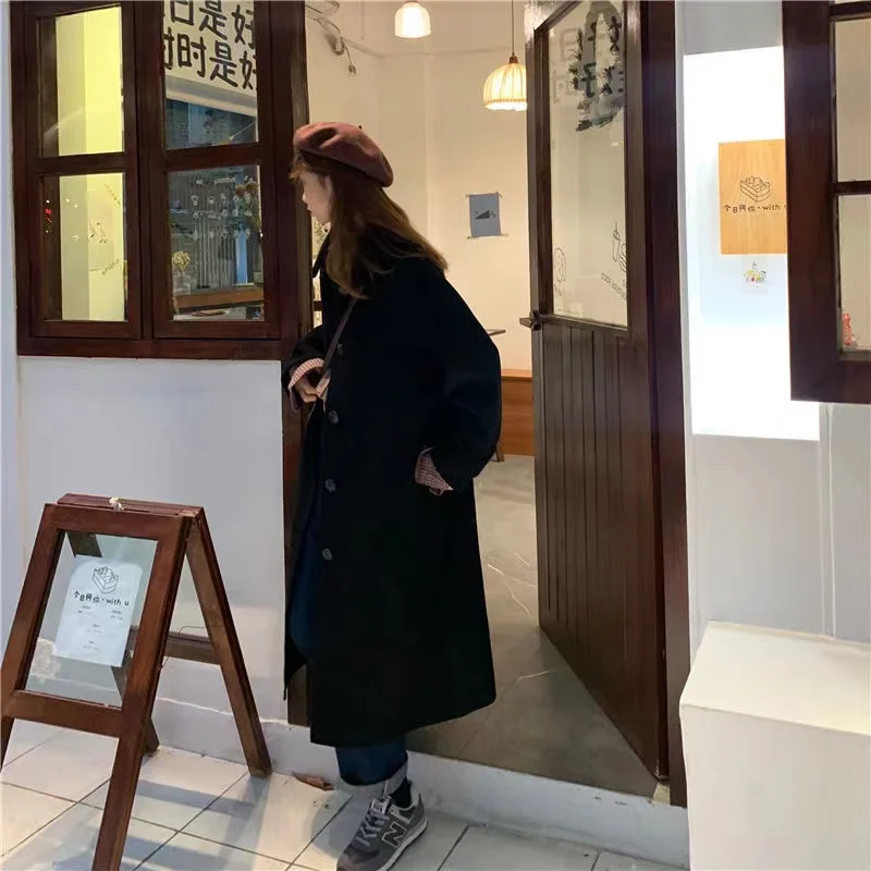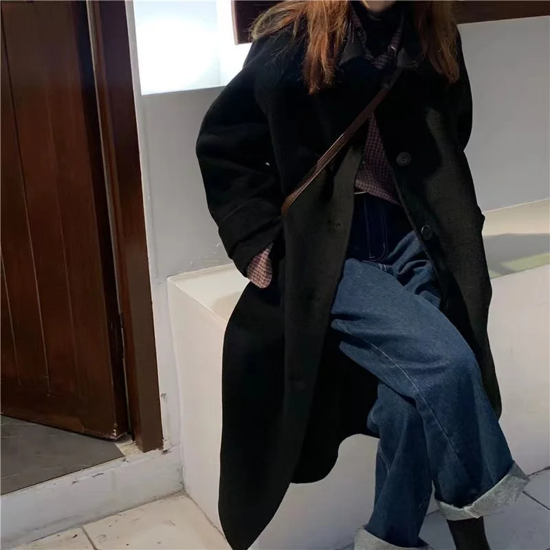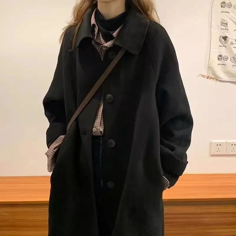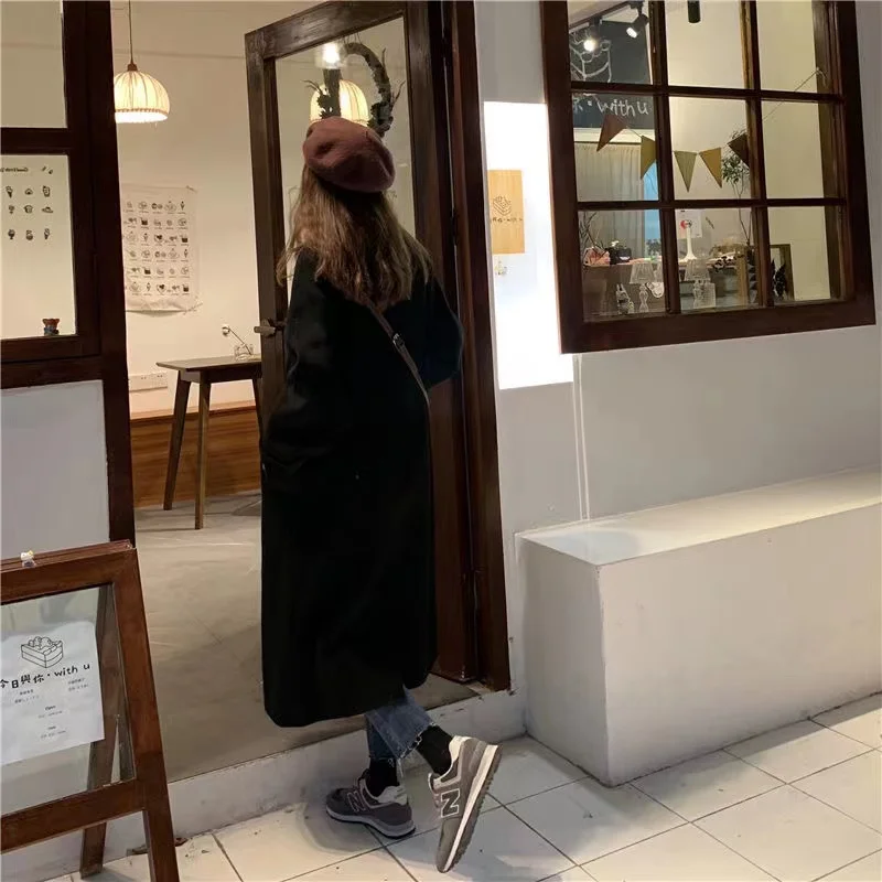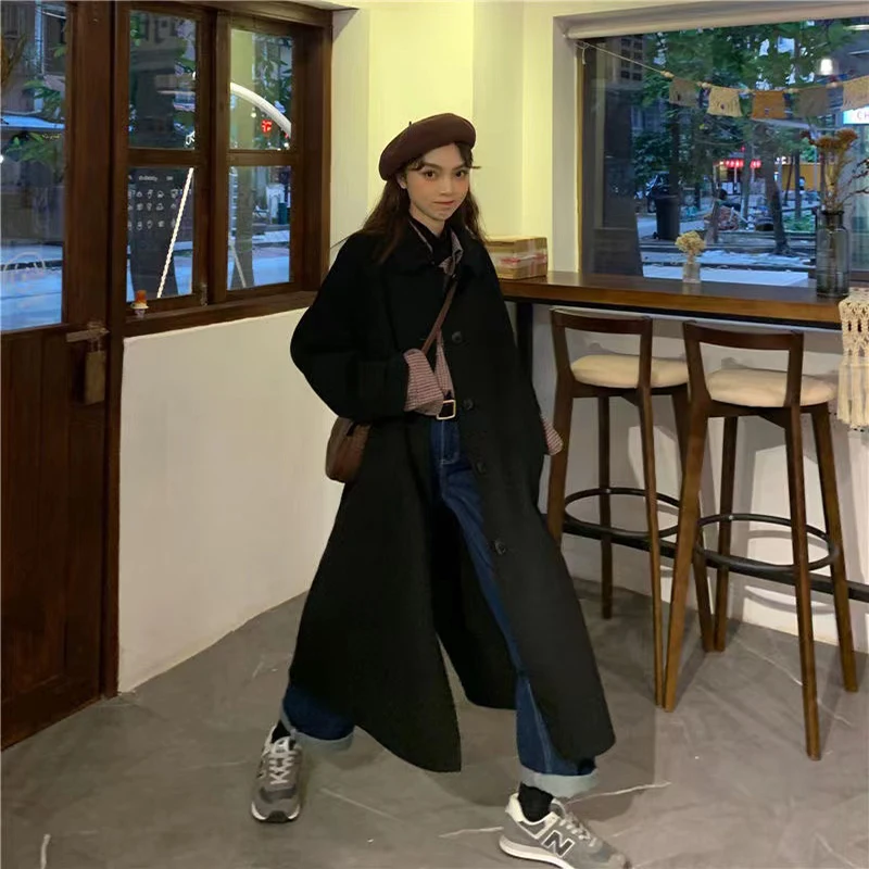 Женское длинное пальто, черная модная ветровка в Корейском стиле преппи в стиле ретро, повседневное теплое шерстяное пальто, весна-Зима 2022, женское плотное пальто