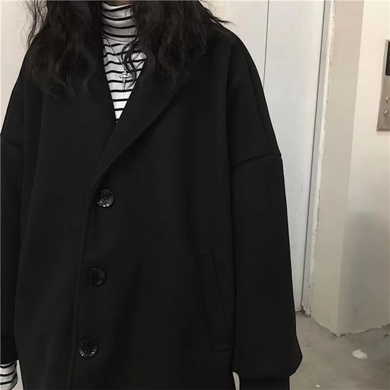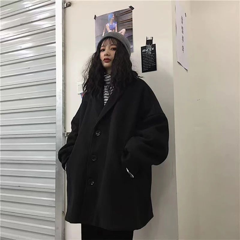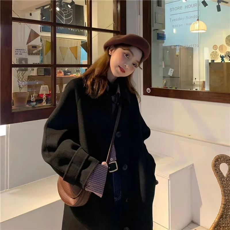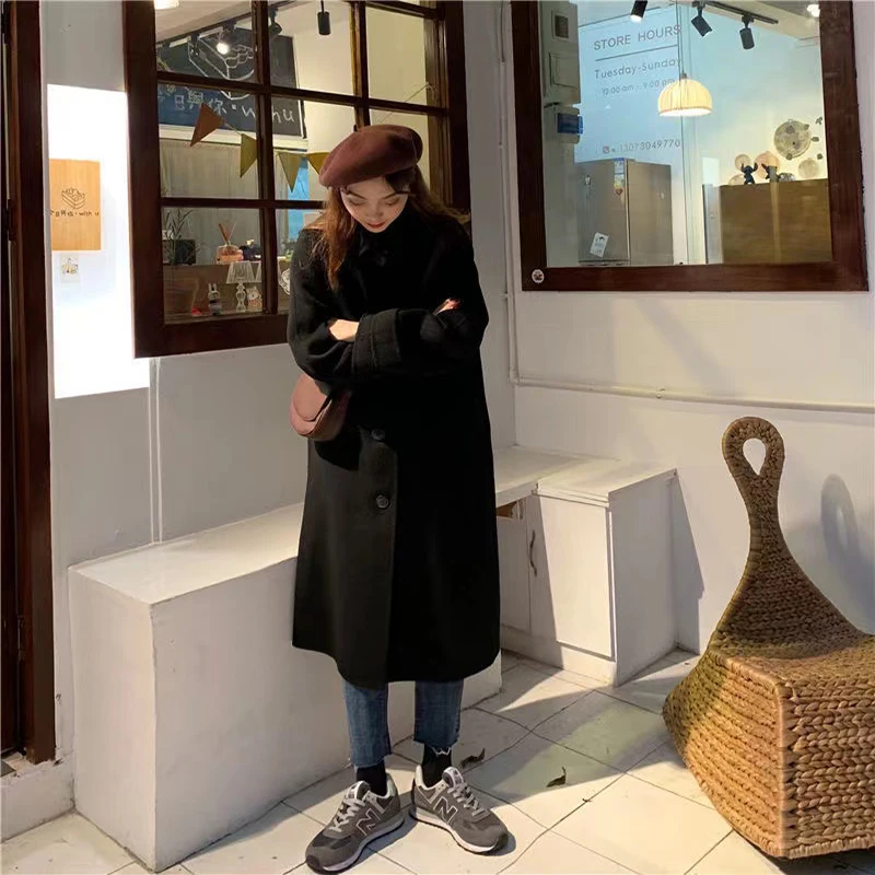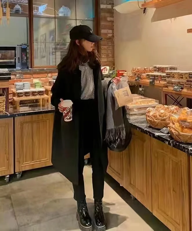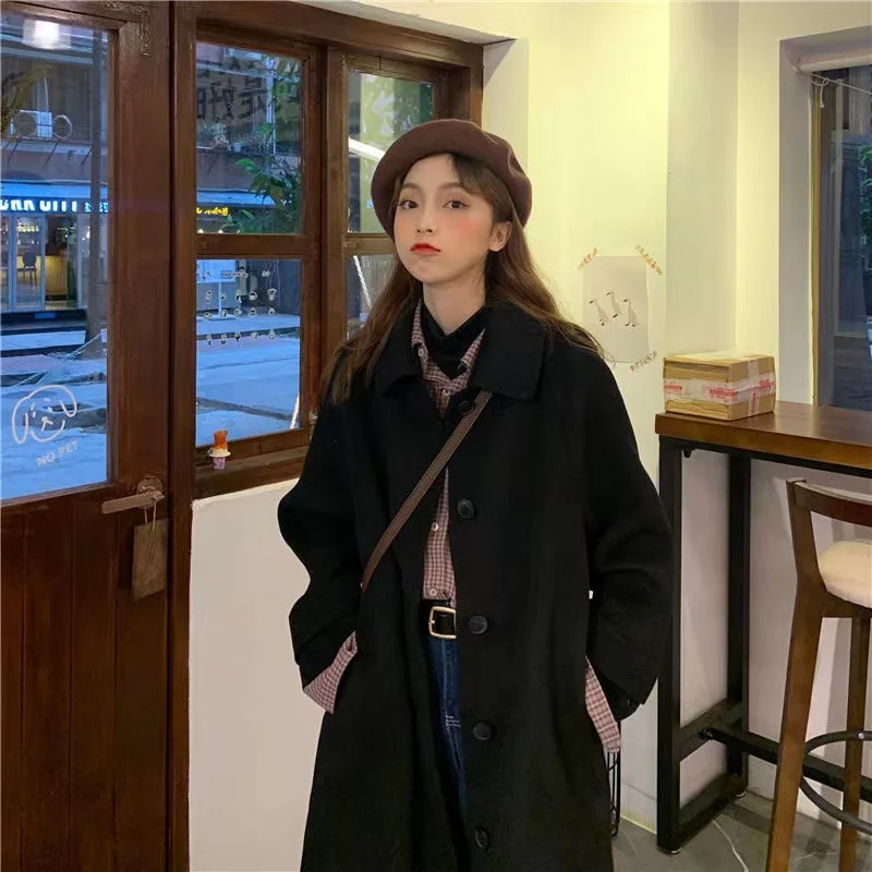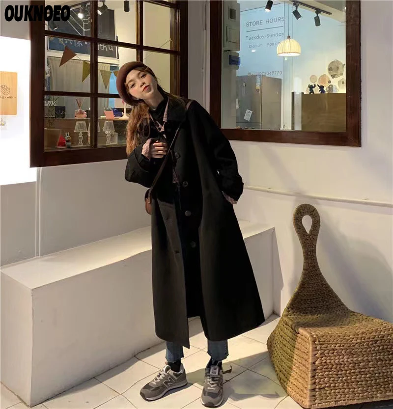 Женское длинное пальто, черная модная ветровка в Корейском стиле преппи в стиле ретро, повседневное теплое шерстяное пальто, весна-Зима 2022, женское плотное пальто