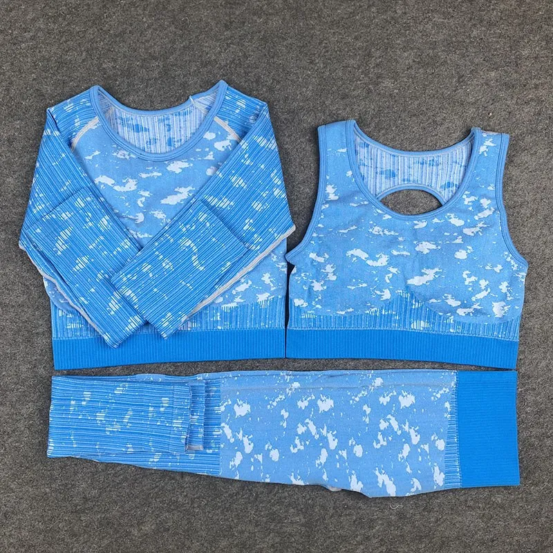 Бесшовный спортивный комплект из 3 предметов, женский синий укороче...