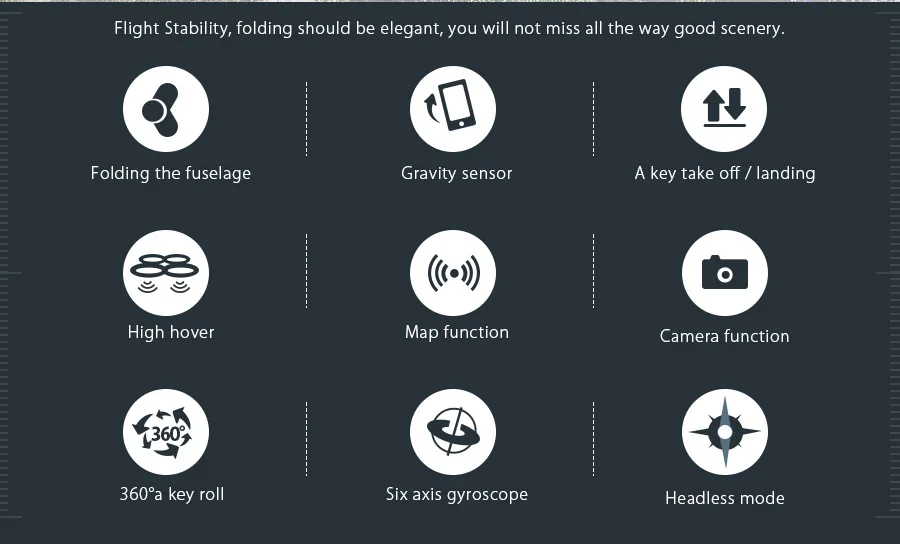 Функция сохранения высоты/складной самолет/шестиполосный гироскоп/одна кнопка взлета/одна кнопка посадки/восходящий и нисходящий/вперед и назад/левая и правая сторона полета/поворот/Безголовый режим (С камерой можно добавить функции: жестовая фотография/Запись видео/Безголовый режим/Аварийная остановка/траектория полета/гравитационное определение/автоматическая фотография)