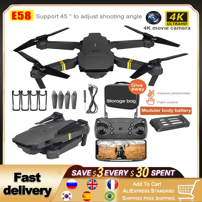 Название продукта: E58 складной КвадрокоптерМодель: E58Цвет: черный, серыйЕмкость аккумулятора: 3.7V600mAH модульная батареяБатарея дистанционного управления: 3 * AAA (не входит в комплект)Время полета: около 8 минутВремя зарядки: 40 минутРежим работы: пульт дистанционного управления/Управление приложениемРазмер изделия: 28*22 см (размер в разложенном виде), размер: 12*7,5 см (Размер в сложенном виде)Расстояние дистанционного управления: около 150 метровРазрешение видео: камера 4K