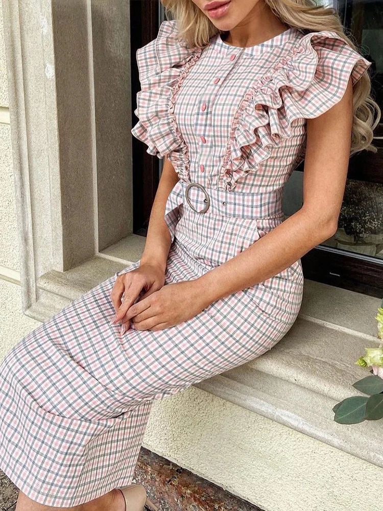 Платья Shein Romwe для женщин, модель 2022 года, Повседневное платье без рукавов, с оборками, в клетку, с принтом, на пуговицах, облегающее платье, Повседневное платье-миди