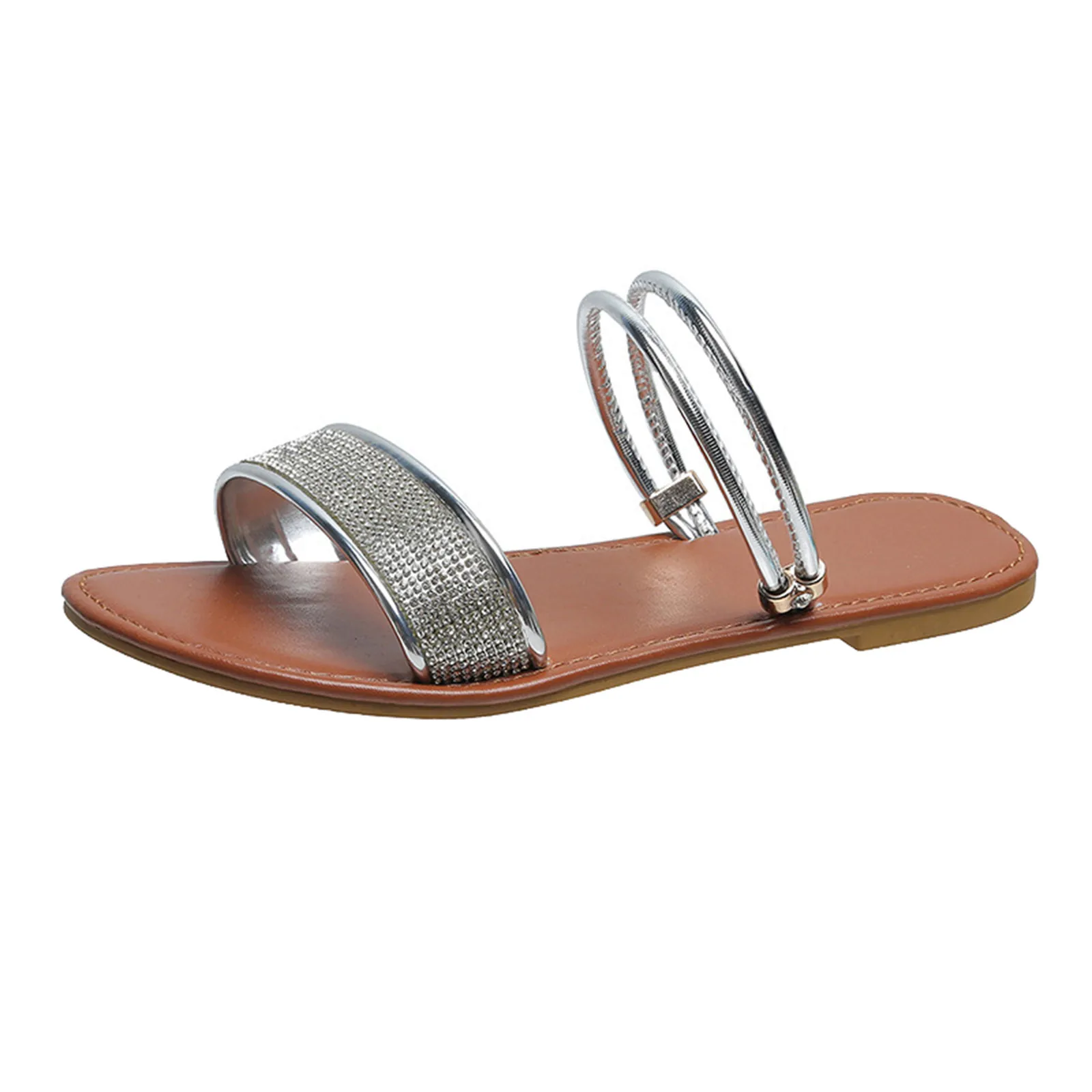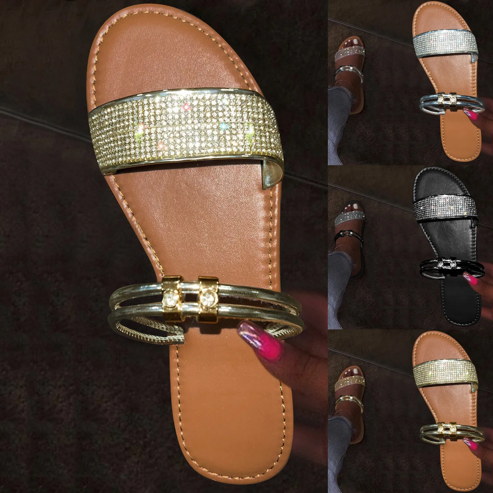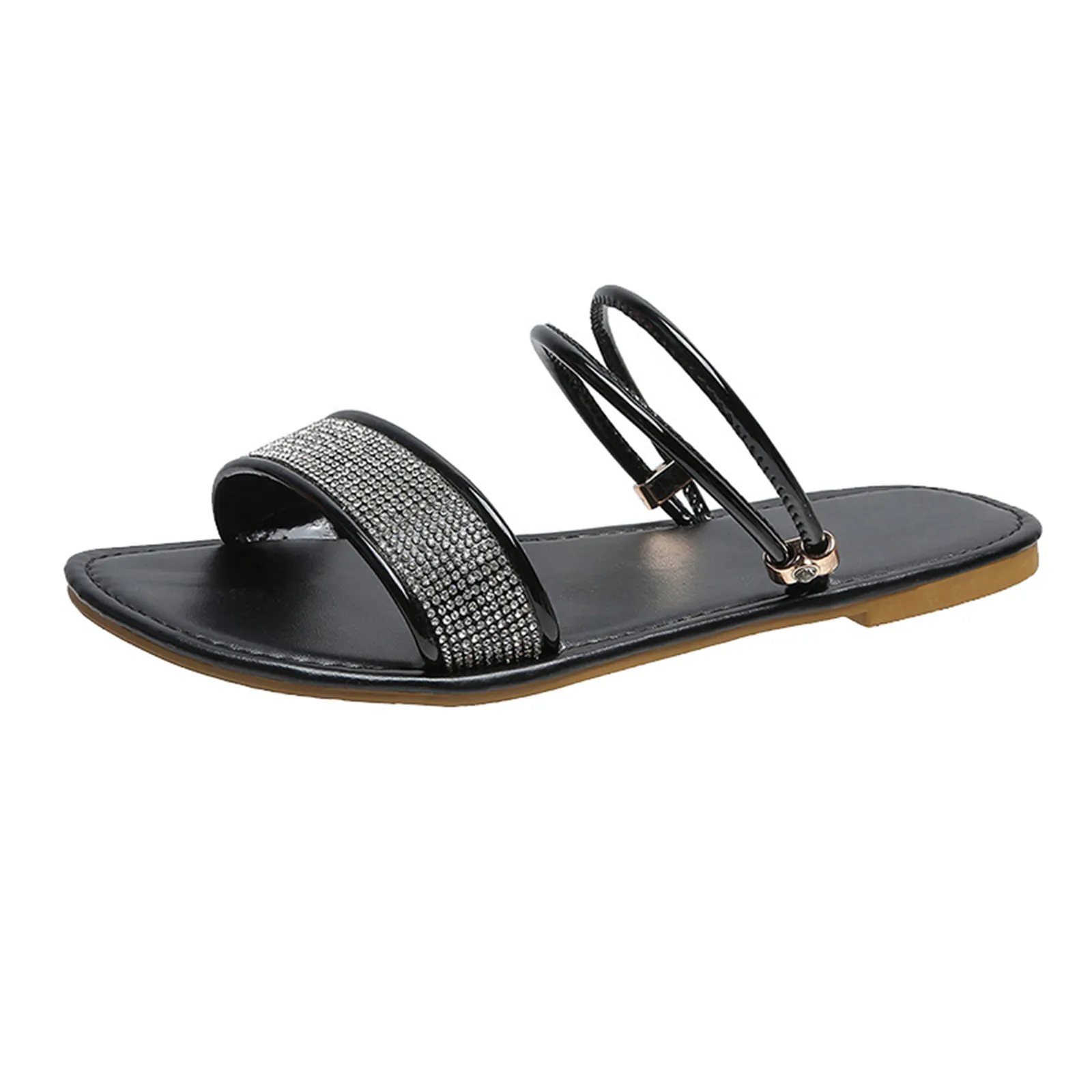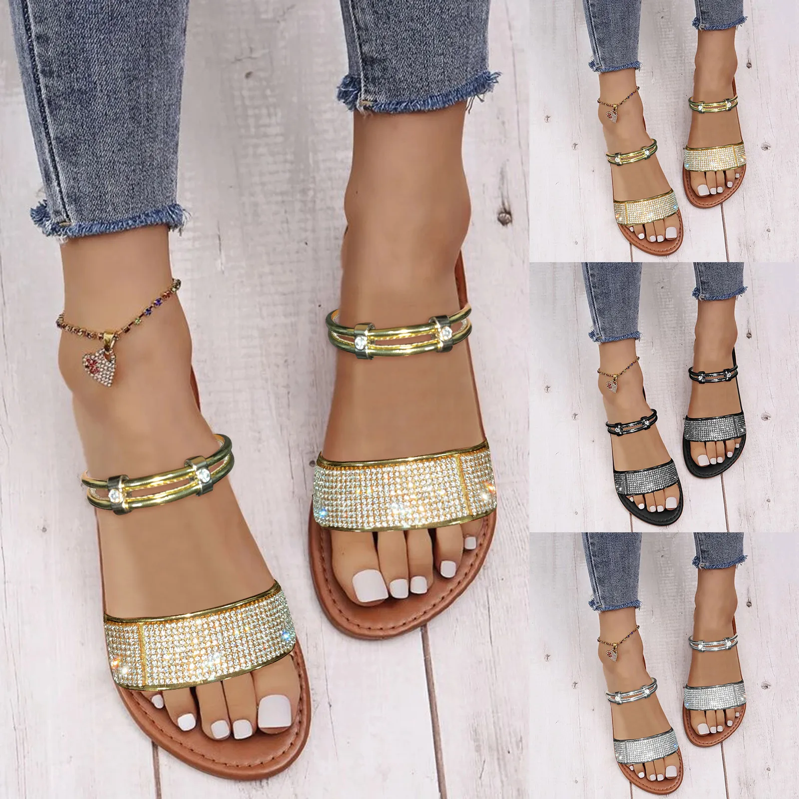 Сандалии женские кожаные со стразами, модные пляжные шлепанцы для офиса, повседневная обувь на плоской подошве, Нескользящие, для лета