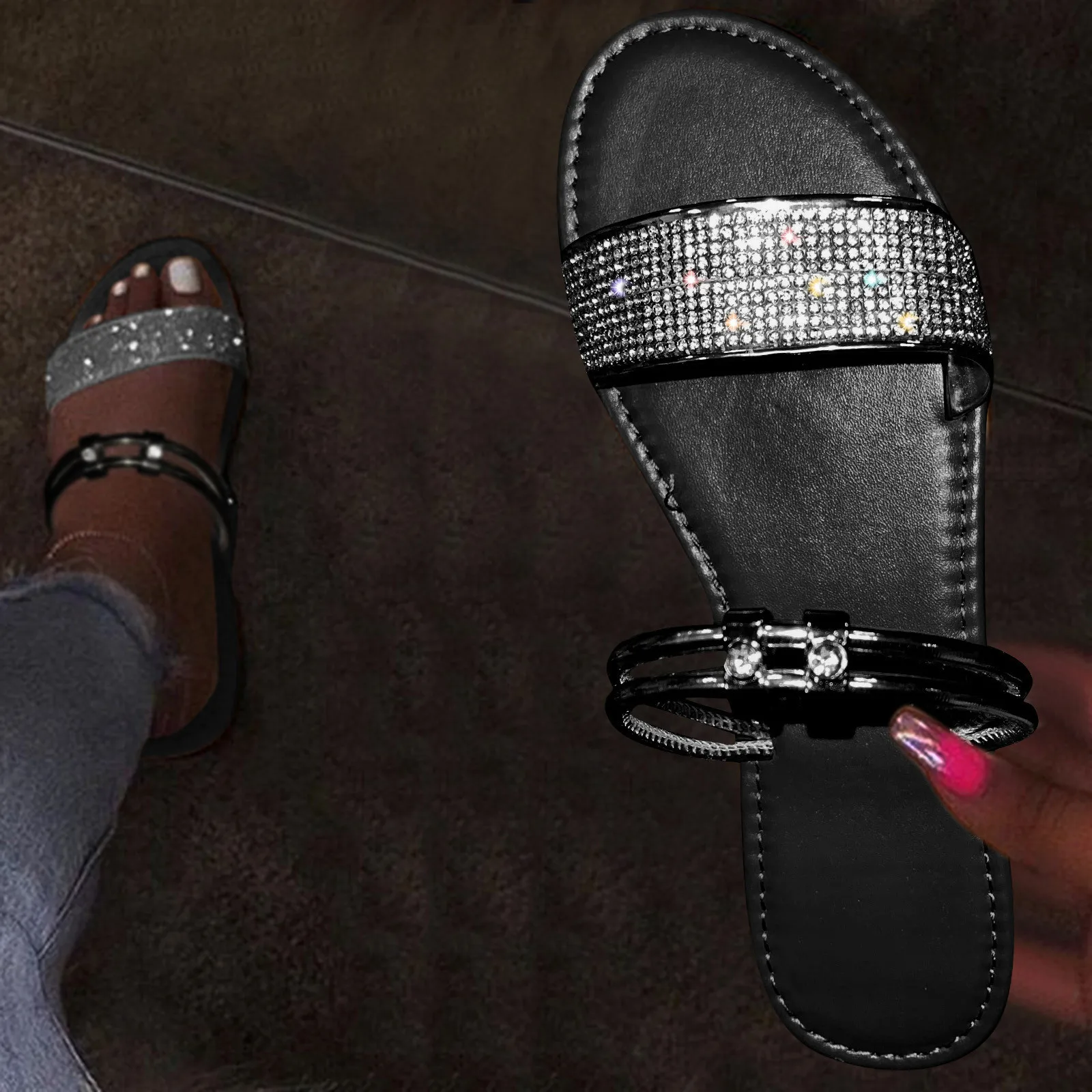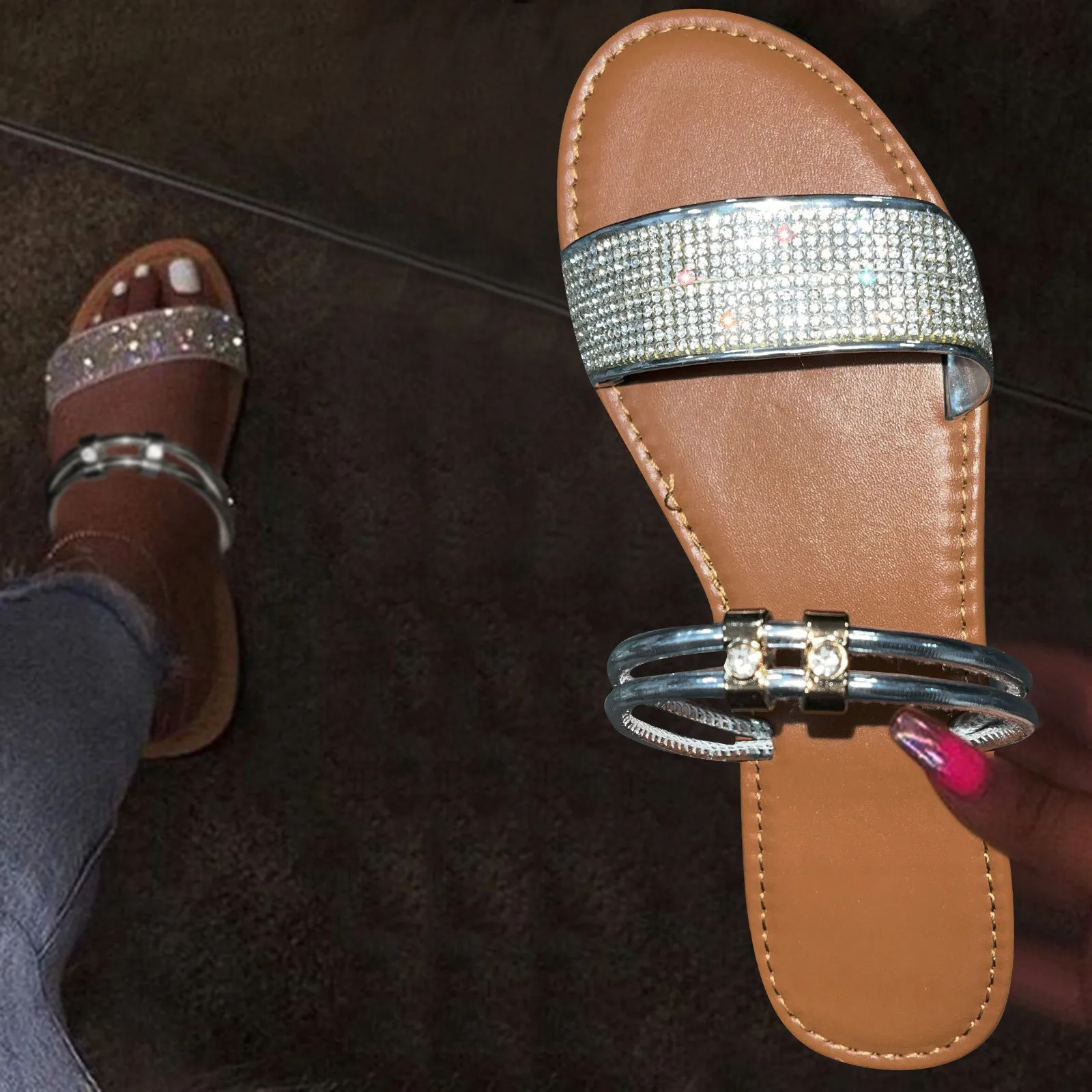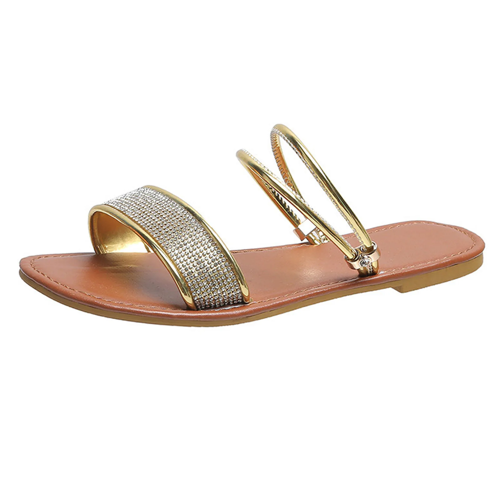 Сандалии женские кожаные со стразами, модные пляжные шлепанцы для офиса, повседневная обувь на плоской подошве, Нескользящие, для лета