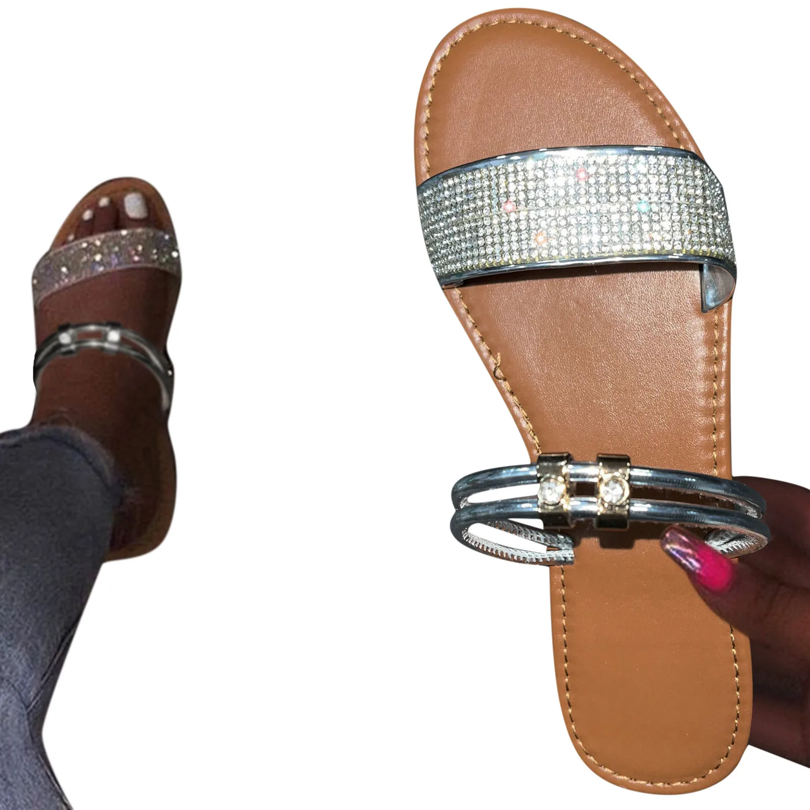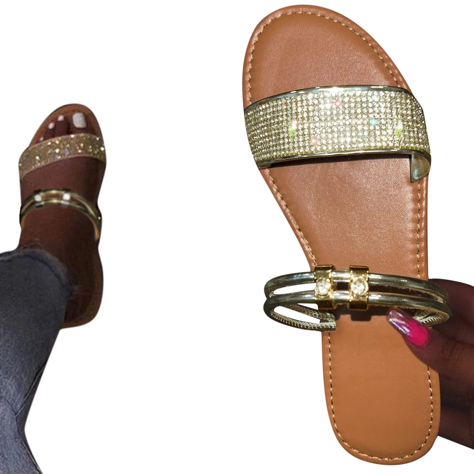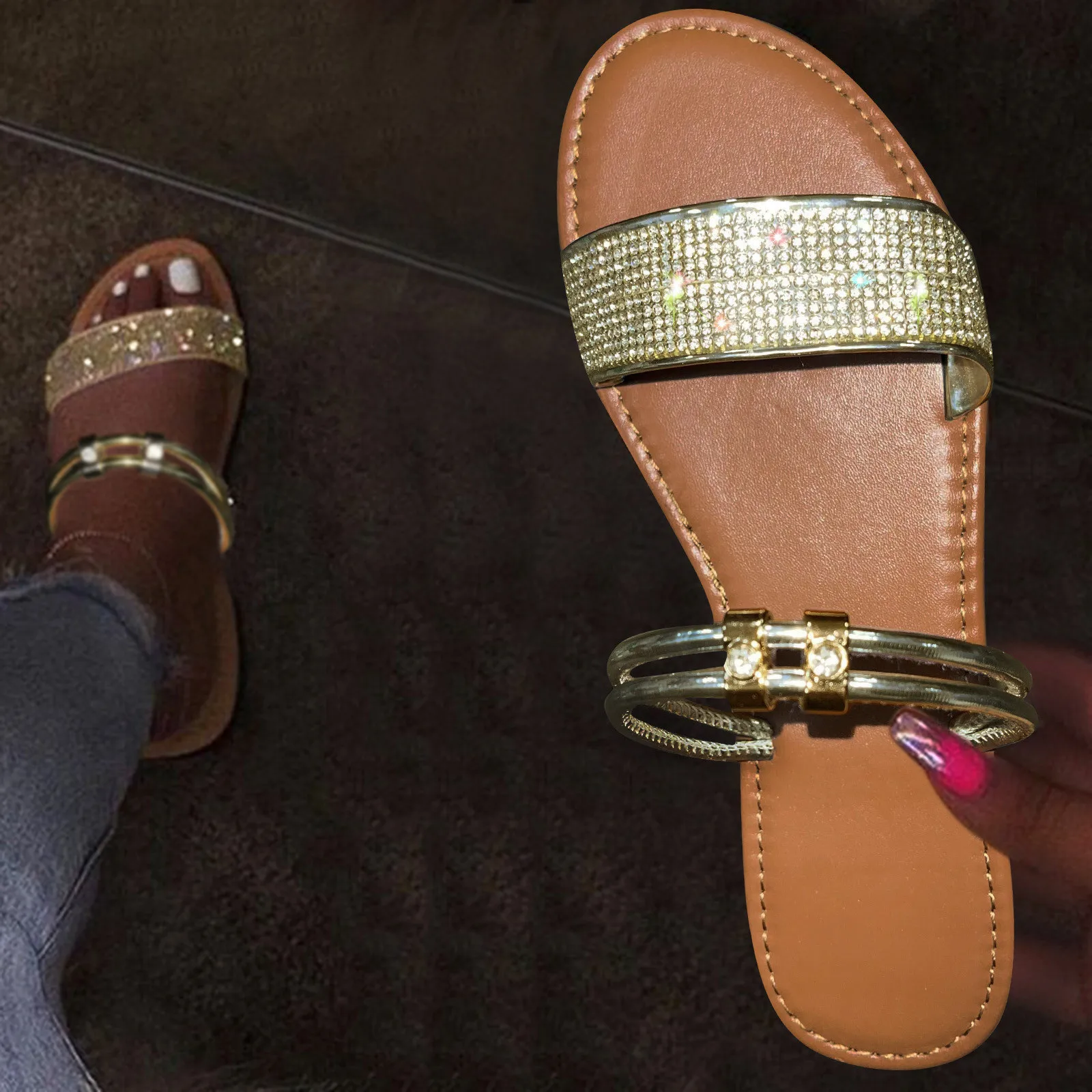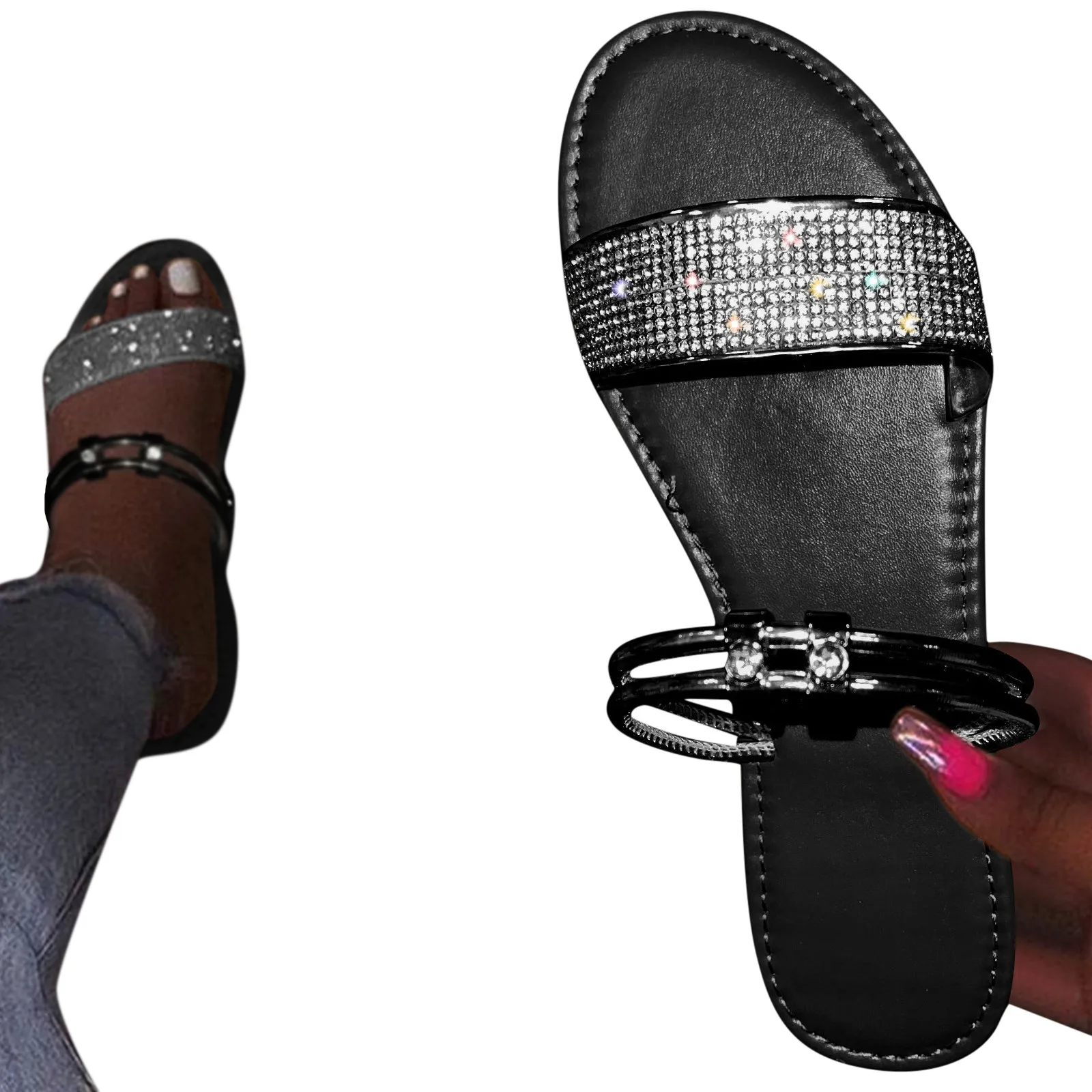 Сандалии женские кожаные со стразами, модные пляжные шлепанцы для офиса, повседневная обувь на плоской подошве, Нескользящие, для лета