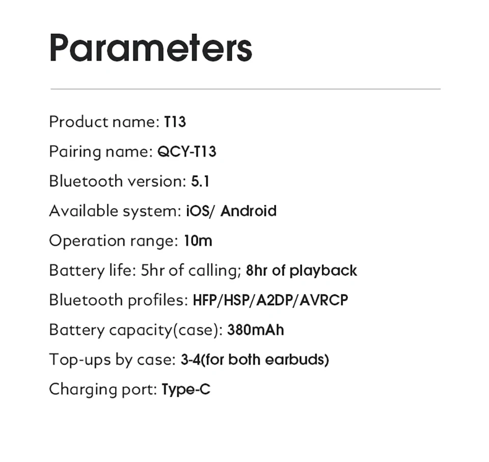 Название продукта: T13Происхождение: КитайНазвание бренда: QCYИмя сопряжения: QCY-T13Версия Bluetooth: 5,1Доступная система: iOS/ AndroidРабочий диапазон: 10 м/32,8 футовСрок службы батареи: 5 часов вызова; 8 часов воспроизведенияПрофили Bluetooth: HFP/HSP/A2DP/AVRCPЕмкость аккумулятора (чехол): 380 мАчВерхний чехол: 2-3 (для обоих наушников)Порт зарядки: Type-CСтиль: ушной крючокСертификация: CEПринцип звучания: ДинамическийКнопка управления: ДаАктивное шумоподавление: нетРегулятор громкости: ДаЧувствительность: 108дбИспользование: видеоигры, мобильный телефон, музыкальные наушники, спортКоличество драйверов: 2Тип вилки: нетДиапазон сопротивления: до 32 ΩСопротивление: 30 ΩТип чашки: герметичныйМатериал чашки: силиконКодеки: AAC/SBC *Поддержка карты памяти: нетДиаметр динамика: 7,2 ммВодонепроницаемость: ДаЧастотный диапазон отклика: 20-20000 ГцОбщее гармоническое искажение: 0.01%Включает микрофон: ДаОсобенности: двойное соединение, управление воспроизведениемСпособ зарядки: чехол для зарядкиТип магнита: другоеЦвет: белый/черныйВремя работы в режиме ожидания: 30 часовВремя воспроизведения музыки: прибл. 7-8 часовВремя вызова: прибл. 5 часовВремя зарядки: прибл. 1 часТип беспроводных наушников: беспроводные наушники TWS