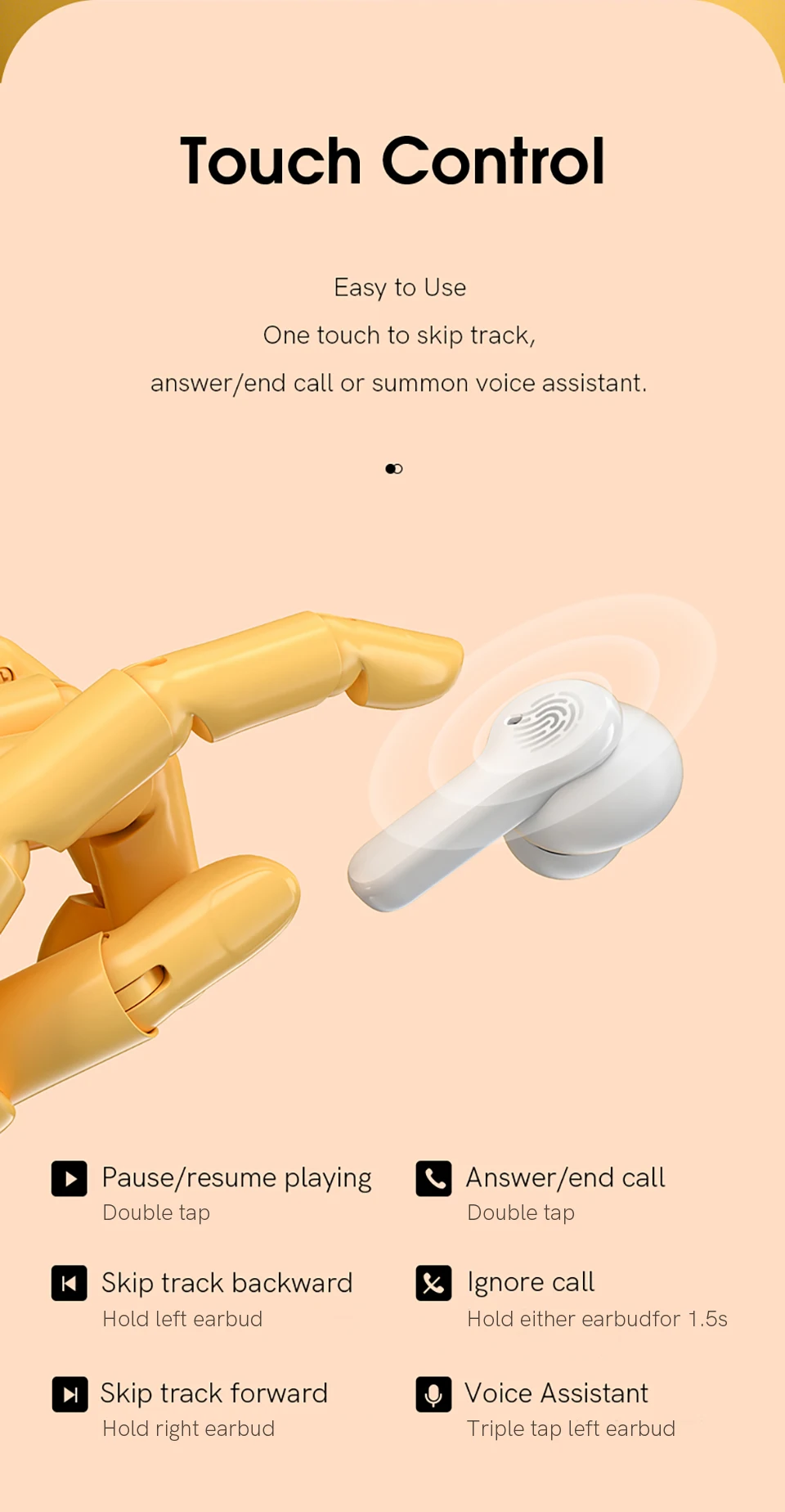 Слегка нажмите или дважды коснитесь этих беспроводных наушников, чтобы изменить музыку, ответить на телефон и вызвать голосовой помощник.