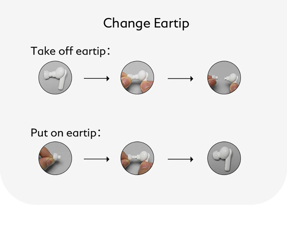 Для приложения требуется Android 6,0 или выше/iOS 11 или выше.Как носить:1. Определение правого и левого наушника2. Наденьте наушники и отрегулируйте их, чтобы соответствовать вам3. Перемещайте микрофон в сторону рта* Пожалуйста, замените на более крупные наушники, если изоляция шума плохая.Как изменить наушники:1. Поверните наушник наизнанку и вытяните, чтобы снять наушник2. Поверните Новый наушник наизнанку и нажмите меньший конец на наушник, прежде чем свернуть его по бокам.Сенсорное управление:1 коснитесь, чтобы пропустить трек, ответить/завершить вызов или вызвать голосовой помощник.Двойное нажатие, чтобы приостановить/продолжить воспроизведение или ответить/завершить вызовУдерживайте наушники в течение 1.5s, чтобы игнорировать вызовУдерживайте Левый наушник, чтобы пропустить назадУдерживайте правый наушник, чтобы пропустить впередТройной сенсорный Левый наушник для голосового ассистентаQCY App T13:Используйте режим сна, чтобы избежать случайной активации.Доступна возможность изменения языка.По умолчанию режимов эквалайзера и прошивка OTA обновления.Вставьте наушники обратно в зарядный чехол, чтобы выйти из режима сна, или вы можете остановить его в приложении QCY.