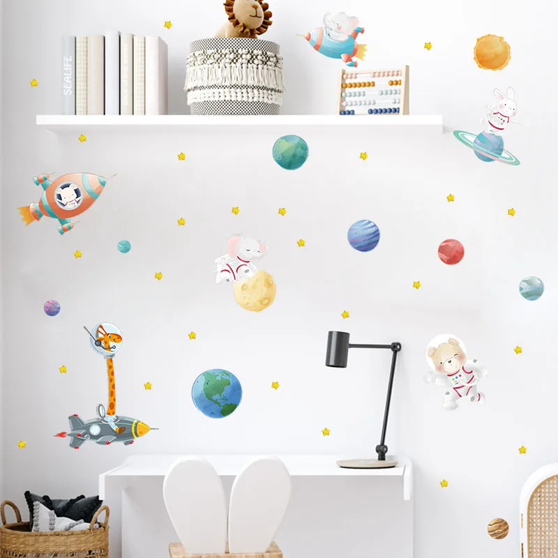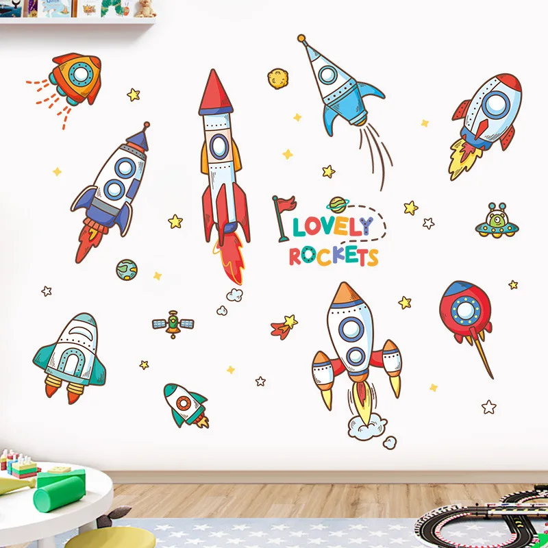 виниловые наклейки Мультяшные настенные наклейки в виде ракеты, космическое пространство, виниловые съемные настенные наклейки, художественные украшения, декор для детей, мальчиков, фрески для игровой комнаты