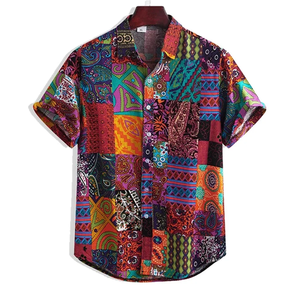Мужская разноцветная летняя свободная Гавайская Повседневная рубашка с короткими рукавами и пуговицами