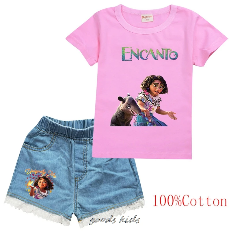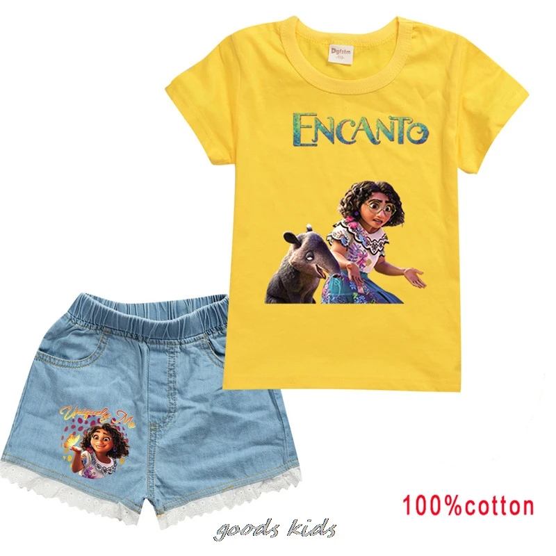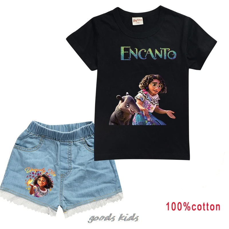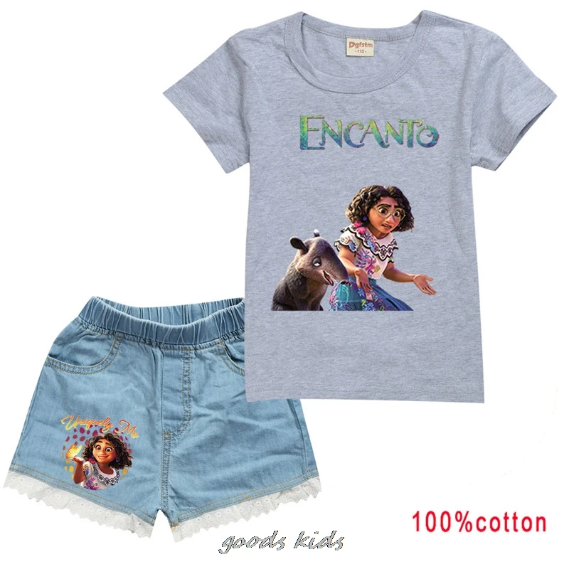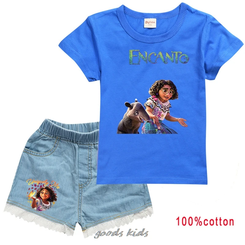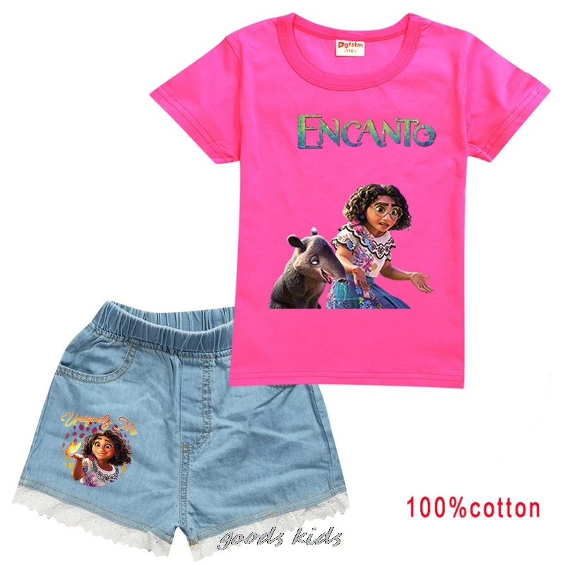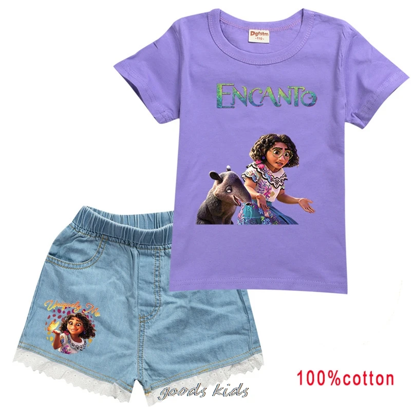 Детская спортивная одежда, футболка для мальчиков и девочек, комплекты детской одежды из 2 предметов, новая одежда с принтом в виде фильма Энканто, спортивный костюм, детская рубашка + джинсовые шорты