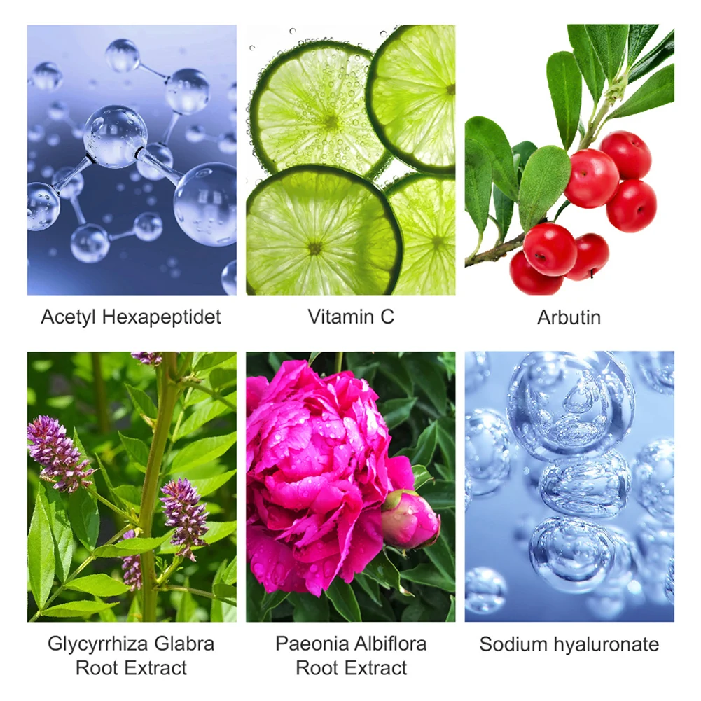 * 2. Состав: арбутин, витамин С, двойной ретинол, экстракт корня солодки, экстракт корня белого пиона, гиалуронат натрия