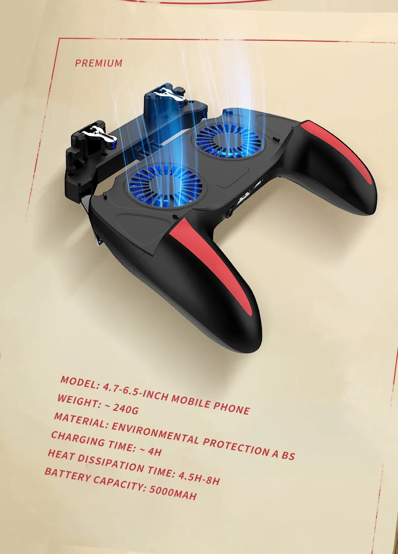 Мобильная игра eat chicken assist артефакт, поддерживает 4,7-6,5 дюймовый экран мобильного телефона, чувствовать себя очень хорошо.Улучшенная скорость и точность стрельбыH10 двойной вентилятор охлаждения ручкиТип использования: 4,7-6,5 дюймовый мобильный телефонМатериал: экологически чистый АБС-пластикВремя зарядки: 4 часаПродолжительность отвода тепла: 4,5-8 часов