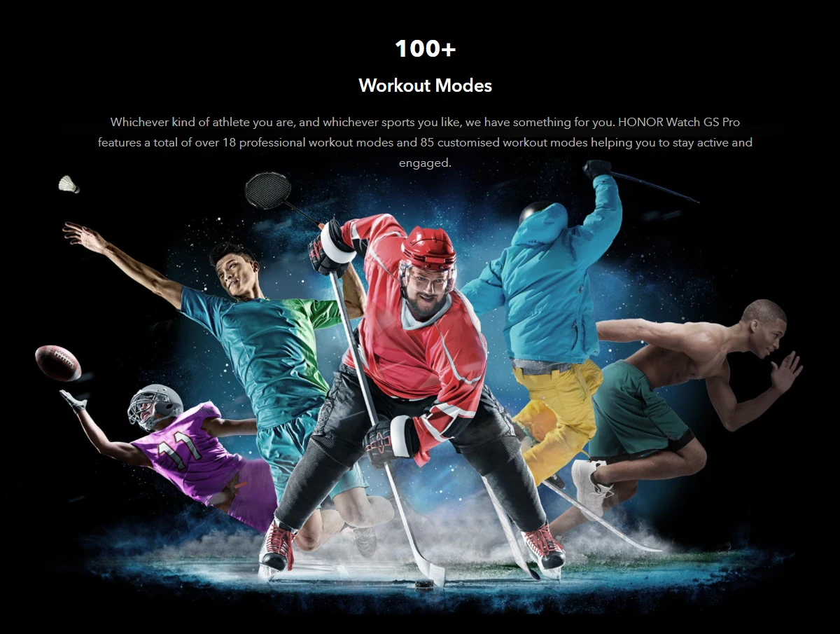 HONOR Watch GS Pro имеет в общей сложности более 18 профессиональных режимов тренировки и 85 индивидуальных режимов тренировки, которые помогут вам оставаться активными и занятыми.