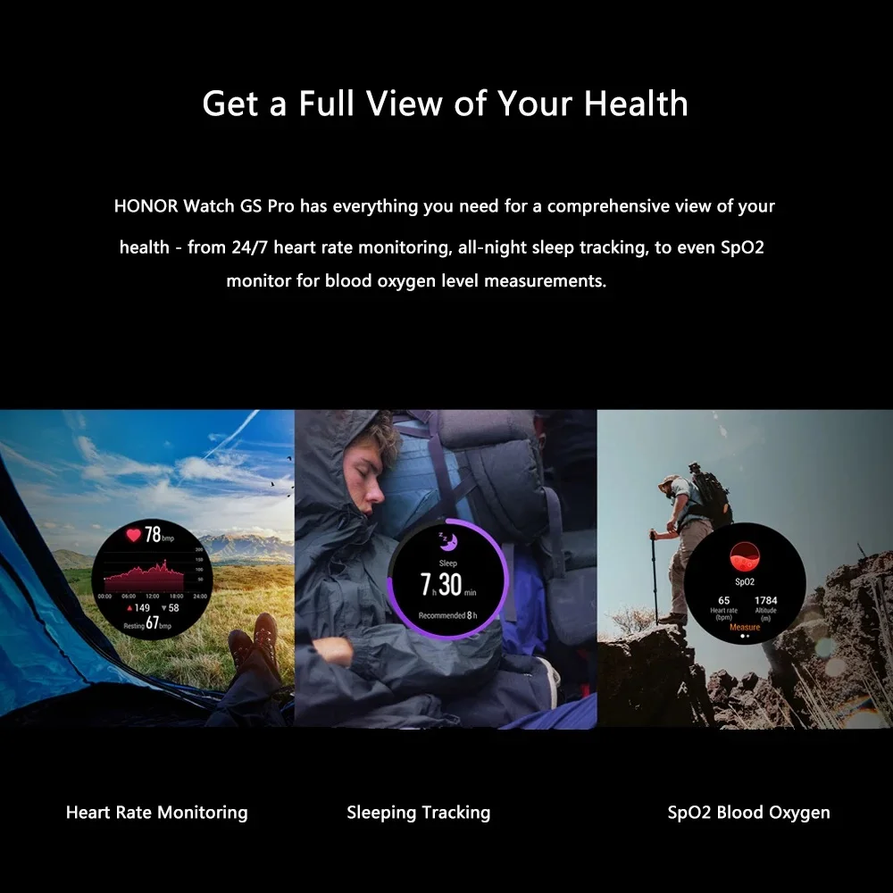 HONOR Watch GS Pro имеет все, что вам нужно для полного просмотра вашего здоровья-от 24/7 мониторинга сердечного ритма, отслеживания ночного сна, до даже SpO2 монитора для измерения уровня кислорода в крови.
