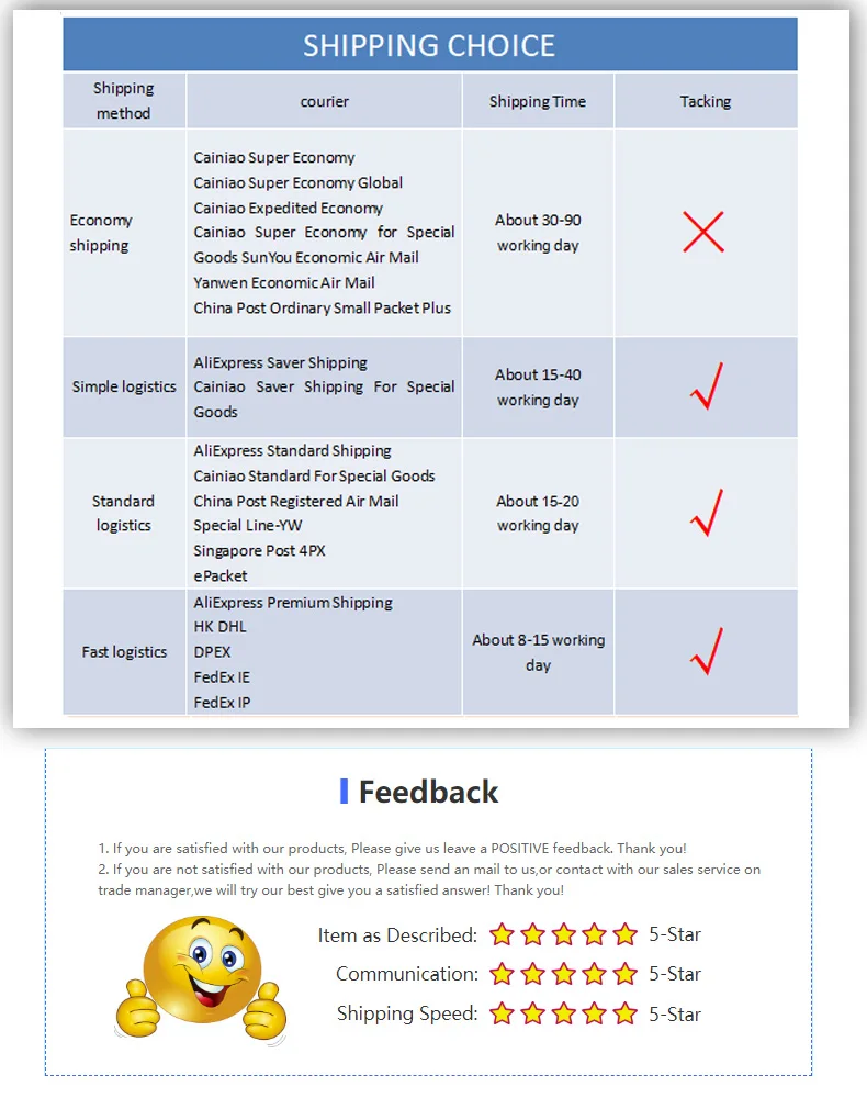 Примечание: (пожалуйста, прочитайте перед заказом) 1. Мы предлагаем вам самый дешевый товар, поэтому после того, как посылка покинет Китай, нет логистической информации. Вы можете получить посылка при нормальных обстоятельствах. Если вы не получили посылка под защитой времени, пожалуйста, свяжитесь с нами, мы обработаем замену или возврат для вас, спасибо. Если вам нужно полное отслеживание, пожалуйста, выберите «AliExpress Стандартная доставка» и добавьте деньги для отслеживания. 2. Если ваше время подтверждения приближается, но вы все еще не получили товар, пожалуйста, свяжитесь с нами, мы продлим дату доставки в первый раз.