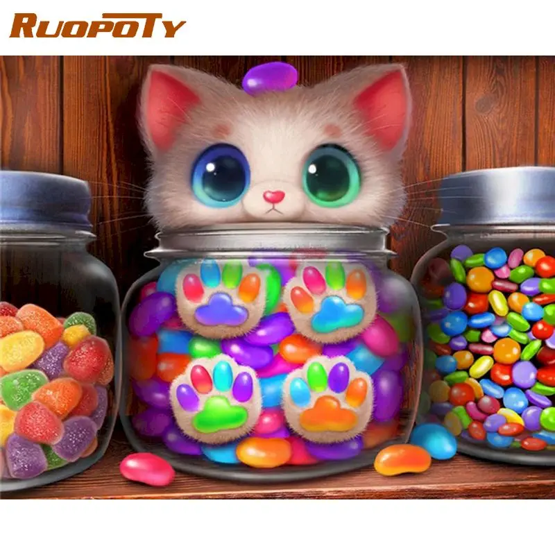 Картина по номерам RUOPOTY, кошка, конфеты, рисование на холсте, ручная роспись, искусство, подарок, DIY картины по номерам, животные, наборы, домашний декор