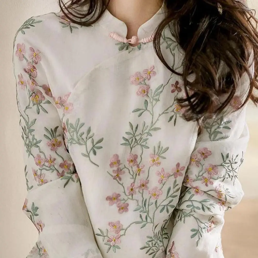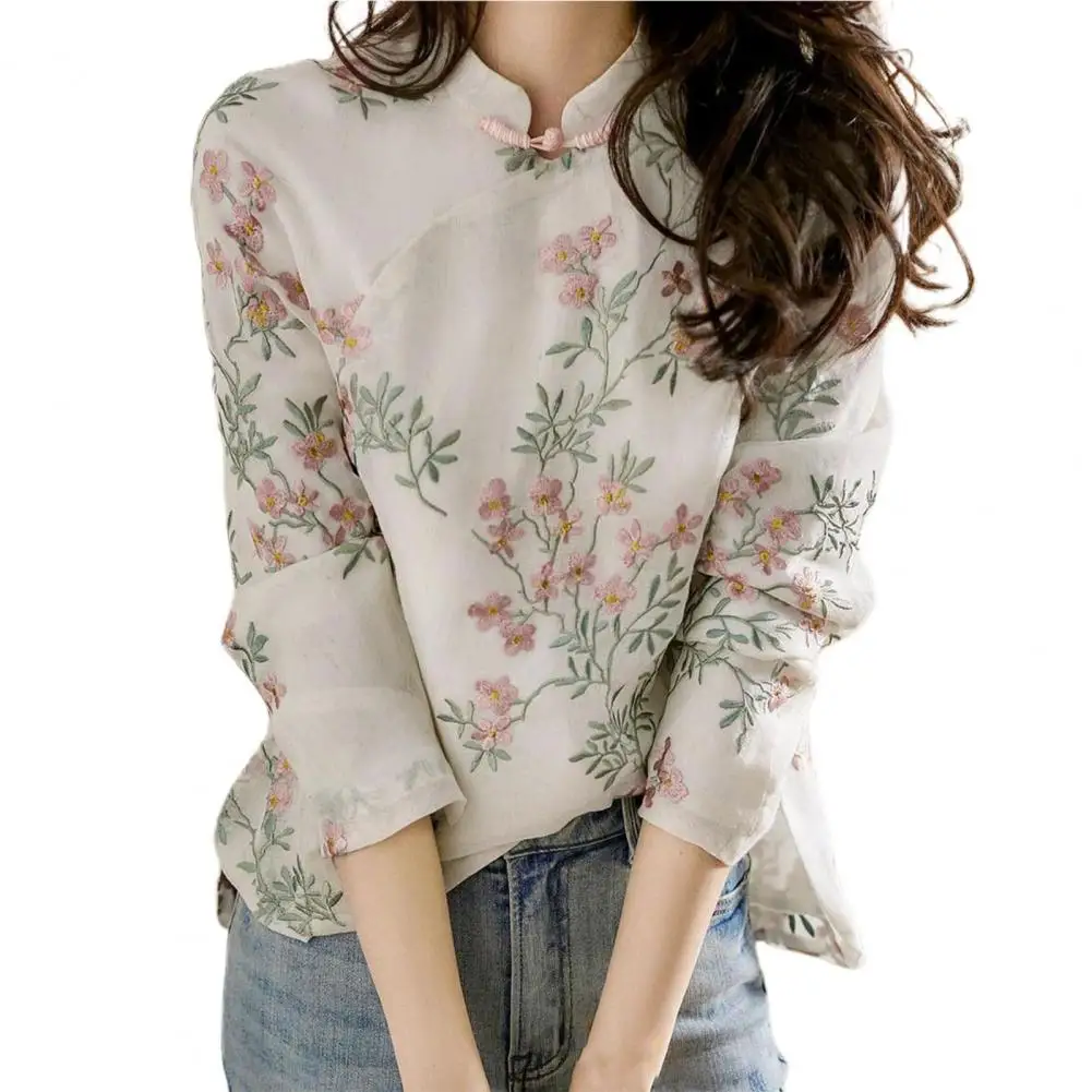 Льняная рубашка-Ципао, блузка в китайском стиле, высококачественные Осенние Топы с длинным рукавом и цветочной вышивкой, элегантная рубашка из хлопка и льна