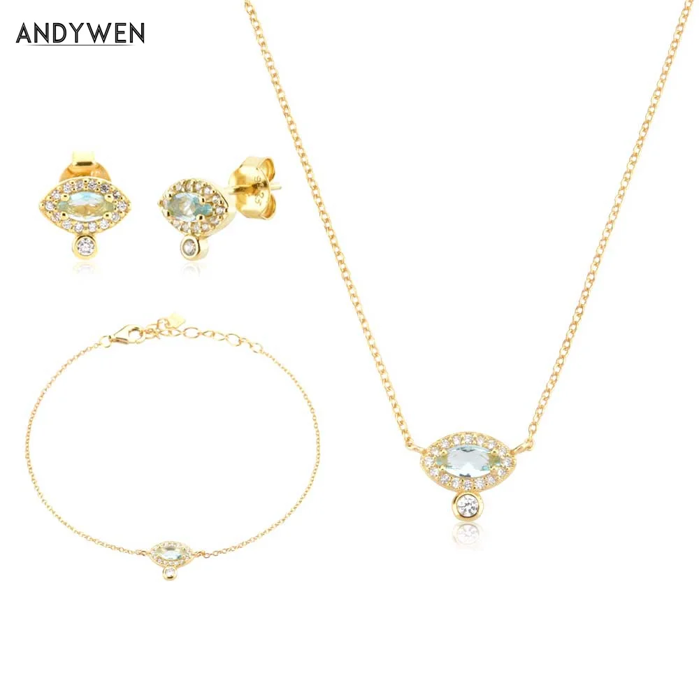 ANDYWEN, ожерелье из стерлингового серебра 925 пробы с золотистой зажигалкой и голубым цирконием, Очаровательное длинное ожерелье с цепочкой 2021 пробы, украшение для свадебной вечеринки с кристаллами