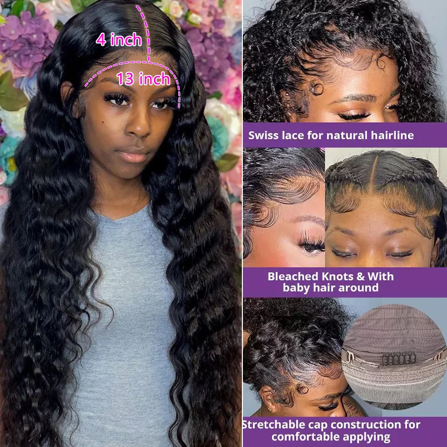30, 40 дюймов, свободная глубокая волна, фронтальная, 13x 4, кружевные передние человеческие волосы, парики, водная волна, вьющиеся человеческие волосы, парики для черных женщин, 250 плотность