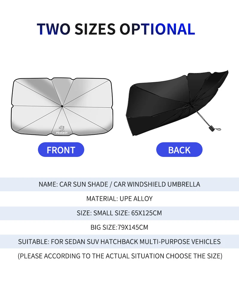Этот автомобильный зонт от солнца изготовлен из высококачественных материалов, с теплоизоляцией, УФ-защитой и долговечной надежностью. Прочная рама и стабильная поддержка обеспечивают долговечность этого автомобильного зонта.