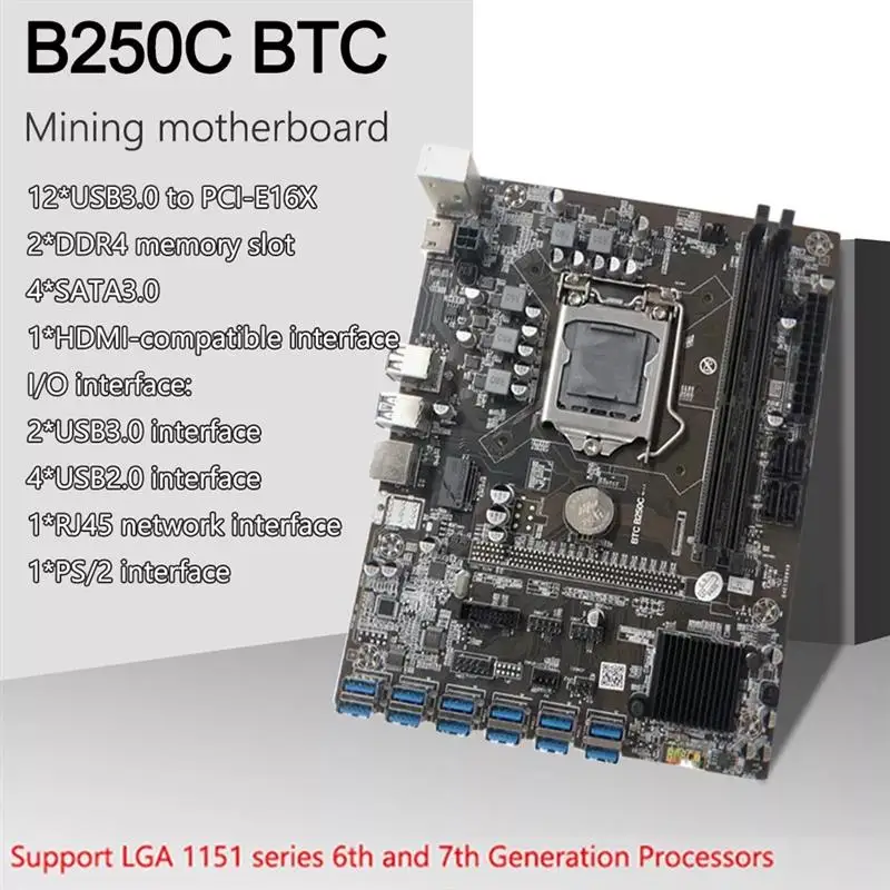 Материнская плата B250C для майнинга BTC, 12 USB 3,0 к PCIe X16 PCI...