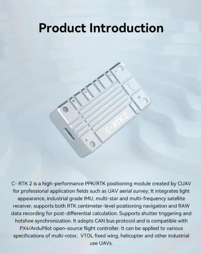 C-RTK 2-это полностью функциональный, экономичный модуль RTK, который может записывать необработанные данные и запись затвора, поддерживает RTK и PPK и может использоваться как мобильная станция или базовая станция. Использование режима связи CAN bus, поддержка высокоскоростного хранения USB и tf-карт, встроенный RM3100 промышленный электронный датчик компаса, MS5611 барометр, ICM-42688-P модуль инерционного навигационного модуля с использованием процессора STM32H7, работающего в режиме реального времени, особенно подходит для воздушной съемки, защиты сельскохозяйственных растений и других сценариев применения.